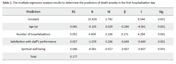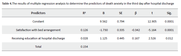 At T3, the univariable analysis revealed that death anxiety had significant relationships with the hospitalization ward (P=0.02), satisfaction with bed arrangement (P=0.001), having a companion (P=0.03), receiving education at hospital discharge (P=0.009), and age (P=0.01). Multivariable analysis through multiple linear regression on variables with P<0.05 in univariable analysis suggested satisfaction with bed arrangement and receiving education at hospital discharge as the significant predictors of death anxiety at T3 (F=17.66; P=0.0001) (Table 4). These two factors explained 15.4% of death anxiety total variance. The most significant predictor was satisfaction with bed arrangement (R2=0.126). Besides, the coefficient of satisfaction with bed arrangement was negative, and the coefficient of education during discharge was positive.