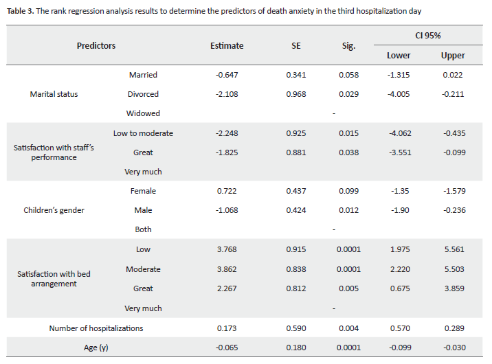 At T2, univariable analysis indicated a significant relationships between death anxiety and age (P=0.009), the number of hospitalizations (P=0.01), spiritual well-being (P=0.02), satisfaction with bed arrangement (P=0.001), receiving information about the underlying illness from healthcare providers (P=0.05), hospitalization ward (P=0.02), children’s gender (P=0.04), and having a companion (P=0.004). Multivariable analysis using the rank regression analysis on variables with P<0.2 in univariable analysis revealed that the significant predictors of death anxiety at T2 were satisfaction with bed arrangement, children’s gender, satisfaction with hospital staff’s performance, marital status, the number of hospitalizations, and age (P<0.5) (Table 3).