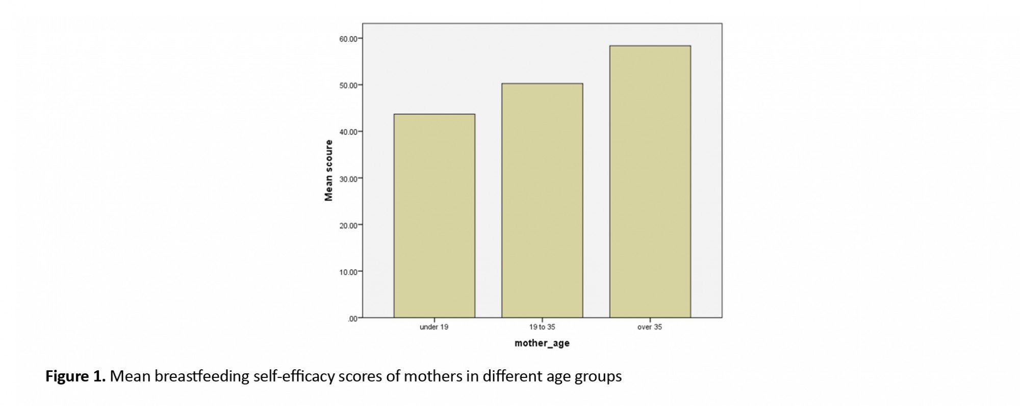 Figure 1 shows the mean breastfeeding self-efficacy scores of participants in different age groups. The Mean±SD scores of breastfeeding self-efficacy were as follows: 43.69±12.48 in mothers under 19 years old, 50.26±10.93 in mothers aged 19-35 years, and 58.35±8.53 in mothers over 35 years old.