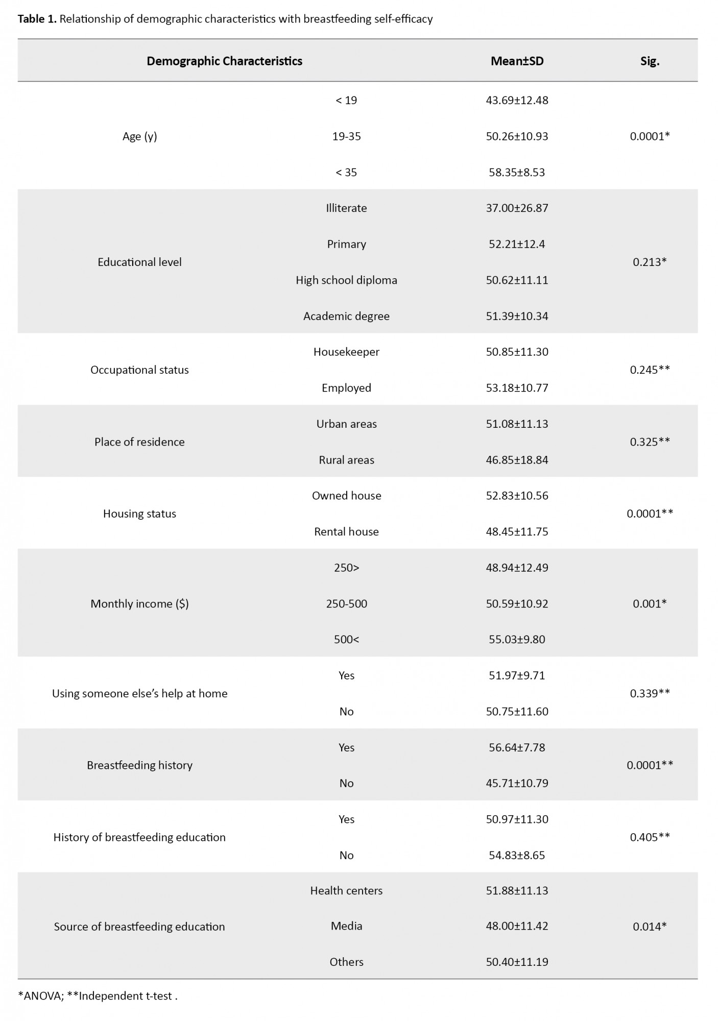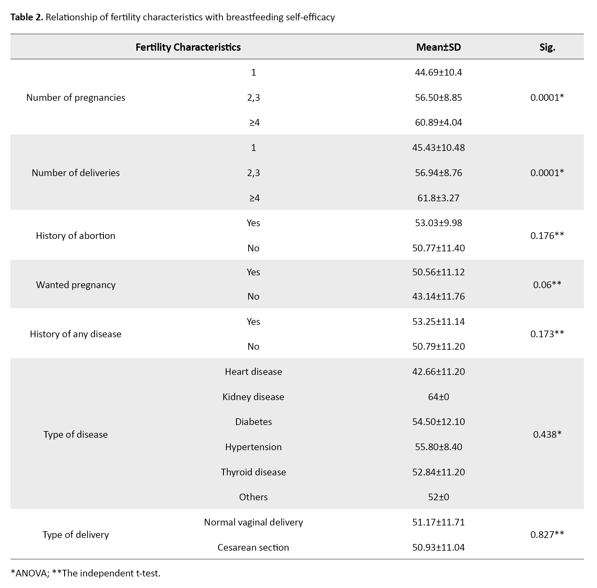 Considering the importance of breastfeeding in maintaining the health of mothers and infants, and since midwives, as a group of the caregivers, are always with mothers, they can identify at-risk mothers and play an essential role in promoting awareness and self-efficacy of breastfeeding in mothers by making appropriate decisions and designing training programs and guiding interventions. In the present study, the history of abortion and disease had no significant relationship with breastfeeding self-efficacy. Further studies in other cities are recommended to enrich our data. In this study, information was obtained through questionnaires and interviews with mothers and was based on mothers’ self-reports; hence, mothers may refuse to answer correctly to some questions.