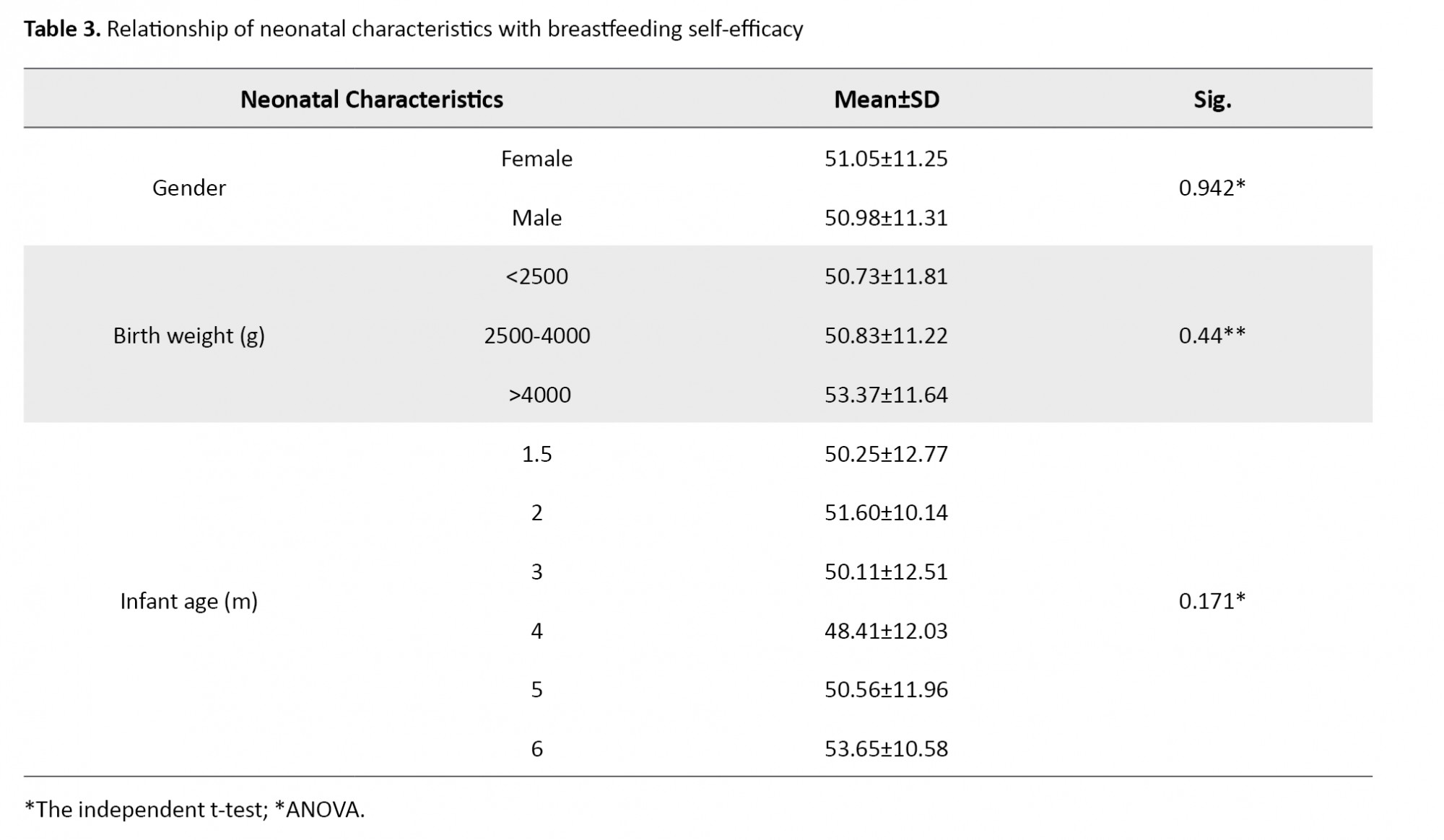 In our study, breastfeeding self-efficacy had no significant relationship with the infant’s gender, weight, and age, which is consistent with Mirghafourvand et al. study [28]. Uchoa et al. found significant relationships between infant weight (3000 g and more) and male sex with breastfeeding self-efficacy, and mothers with low birth weight infants had many concerns about their infants’ condition, which negatively affected their self-efficacy [30]. This inconsistency of the results can be due to differences in cultures and perspectives in different countries.