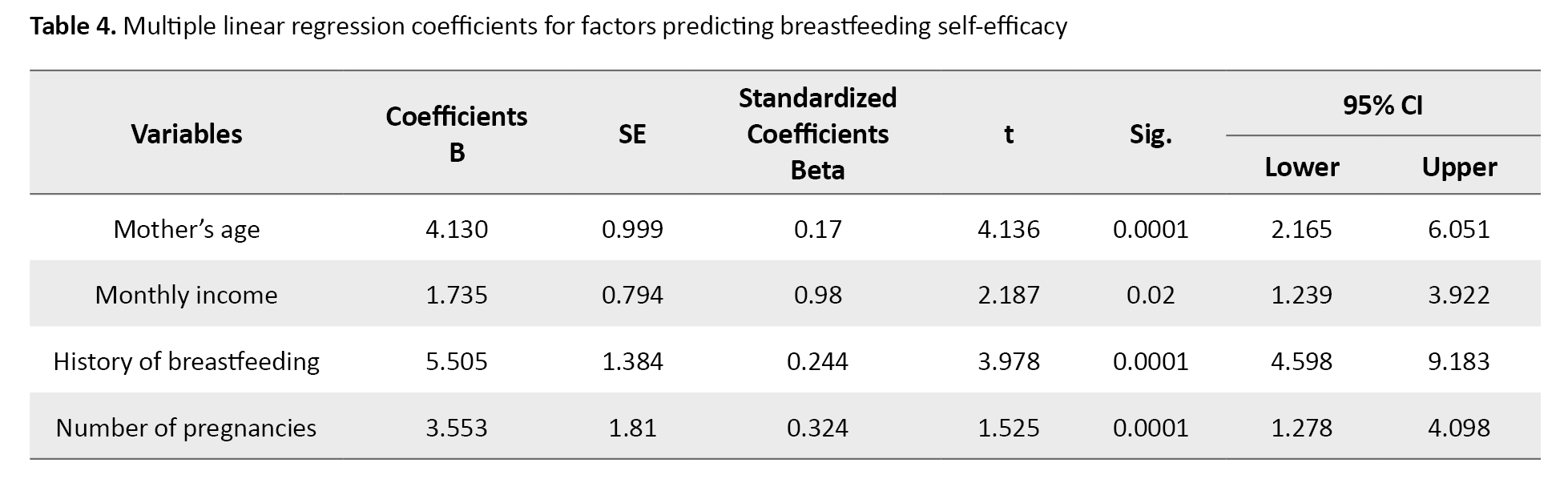The highest mean breastfeeding self-efficacy level was observed in mothers aged over 35 years. There were statistically significant relationships between breastfeeding self-efficacy and maternal age (P=0.0001), housing status (P=0.0001), monthly income (P=0.0001), breastfeeding history (P=0.0001), and source of breastfeeding education (P=0.014) (Table 1). Breastfeeding self-efficacy also had statistically significant relationships with the number of pregnancies (P=0.0001) and deliveries (P=0.0001) (Table 2), but no significant relationship with any neonatal factors (Table 3). One-way ANOVA results showed a statistically significant difference in breastfeeding self-efficacy scores between different age groups (P=0.004). A multiple linear regression model was used to determine the predictors of breastfeeding self-efficacy (Table 4).