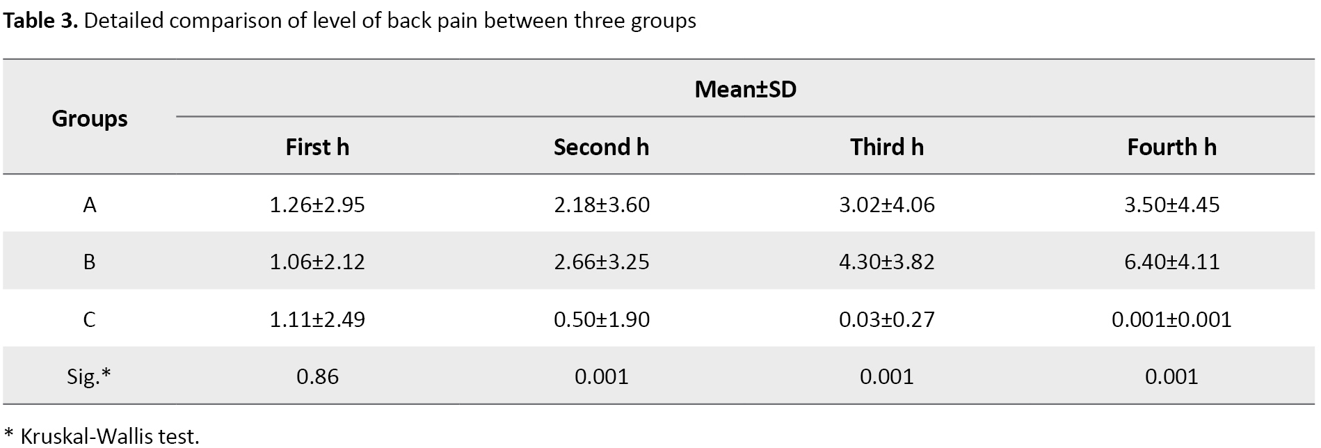 Table 3 presents the detailed comparison of the level of back pain in 3 groups. Therefore, the amount of back pain in groups A and B was more than group C.