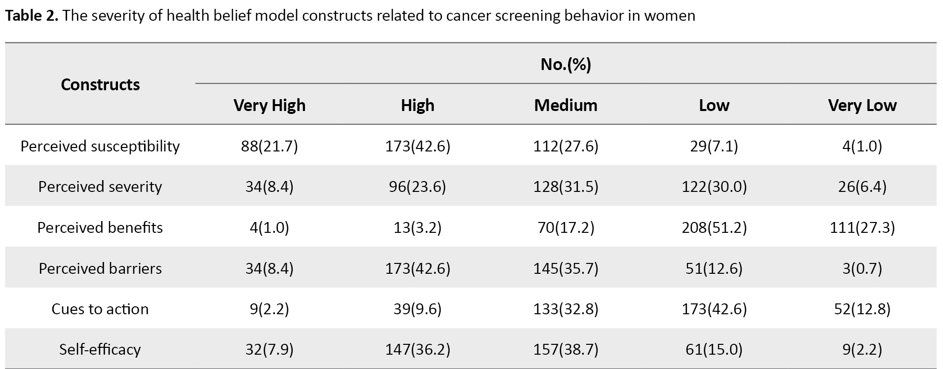 To determine the normal distribution of data, we used the Kolmogorov-Smirnov test. The Mean±SD score of health belief model constructs related to cancer screening behavior in women were as follows: perceived susceptibility, 66.4±18.9; perceived severity, 50.1±21.4; perceived benefits, 28.8±16.6; perceived barriers, 59.0±16.4; cues to action, 38.3±18.7; and self-efficacy 56.2±17.5.