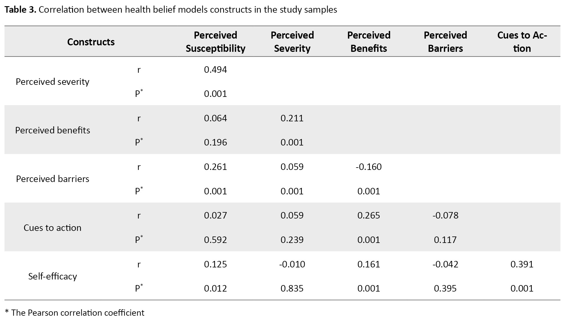 The results of the Pearson correlation coefficient showed that the relationship between perceived barriers and perceived benefits was negative and significant (P=0.001, r=-0.160) (