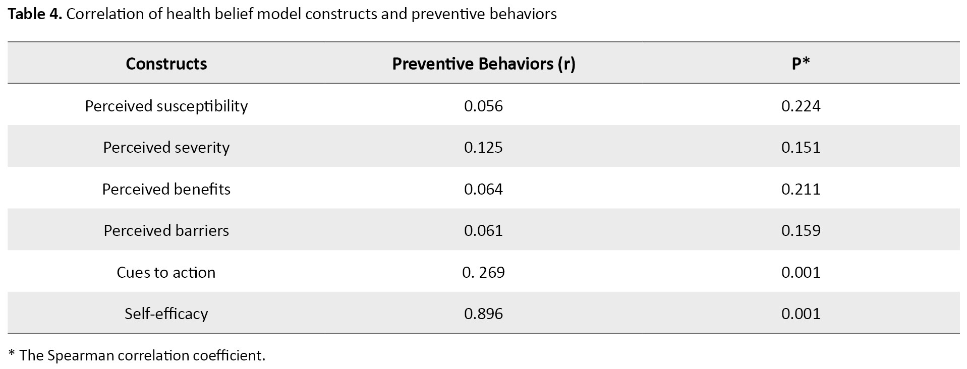 Regarding the relationship between health belief constructs and women’s preventive behaviors, the Spearman statistical test did not show significant relationships between preventive behavior with perceived susceptibility, perceived severity, perceived benefits, and perceived barriers. But this test showed significant relationships between preventive behavior with self-efficacy (P=0.001, r=0.896) and cues to action (P=0.001, r=0.269) (