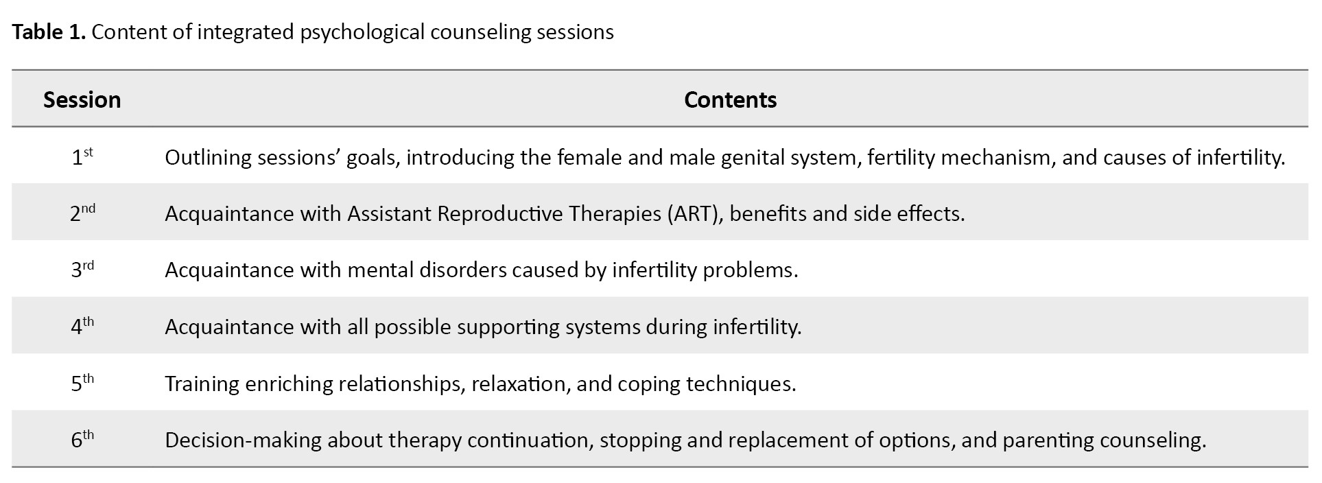 24] were held in a suitable room at the infertility center. The content of counseling sessions, combination of psychological training, supportive counseling, and cognitive-behavioral counseling [