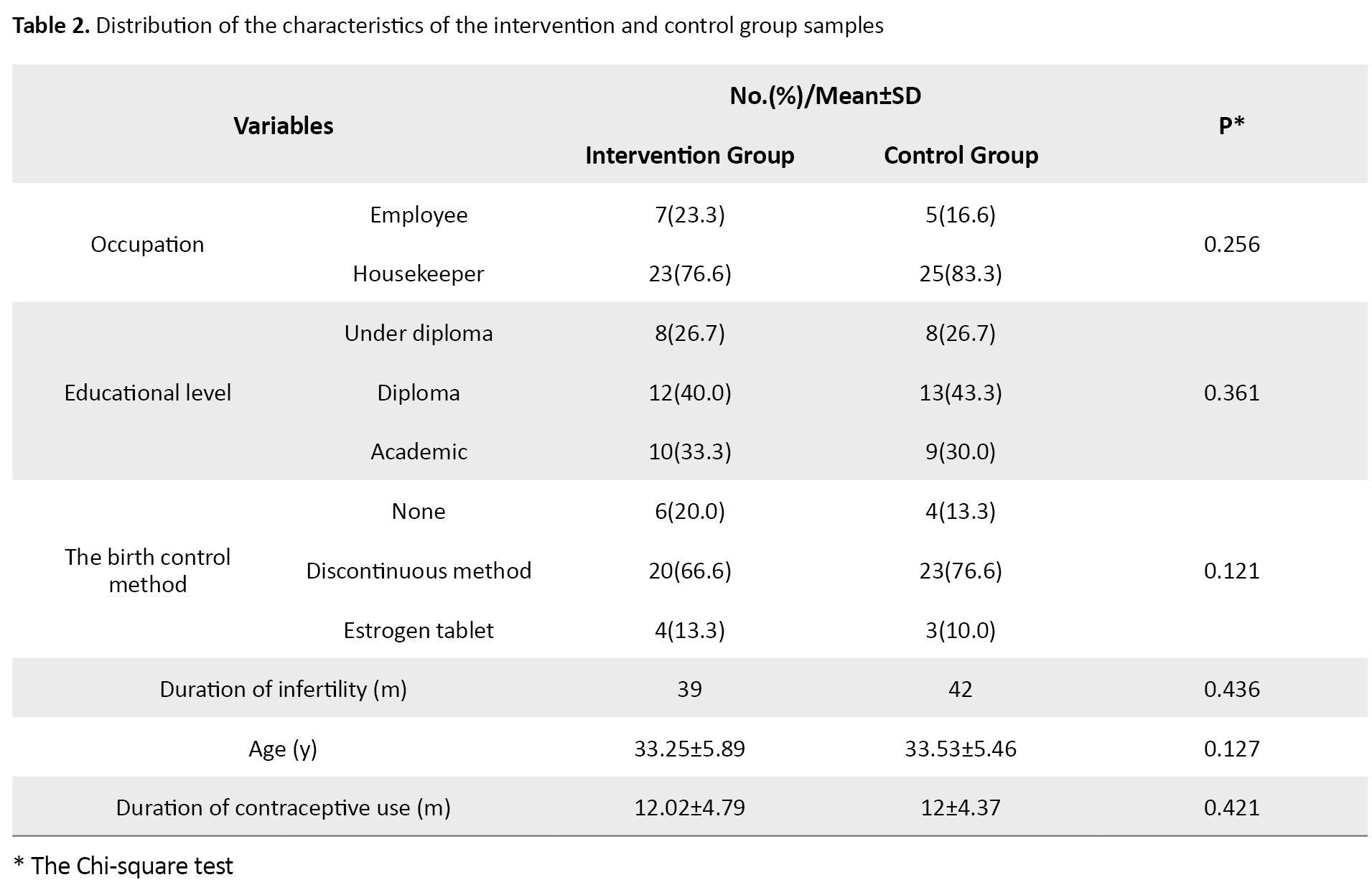 The participants in this study were divided into 3 groups of 20-29, 30-39, and 40-50 years. The Mean±SD age of the participants in this study was 33.25±5.89 and 33.53±5.46 years in the intervention and control group, respectively. There was no statistically significant difference between the mean ages of the two groups. Also, based on the self-report, none of the subjects reported a history of psychiatric illness (depression/obsession/anxiety) before infertility (