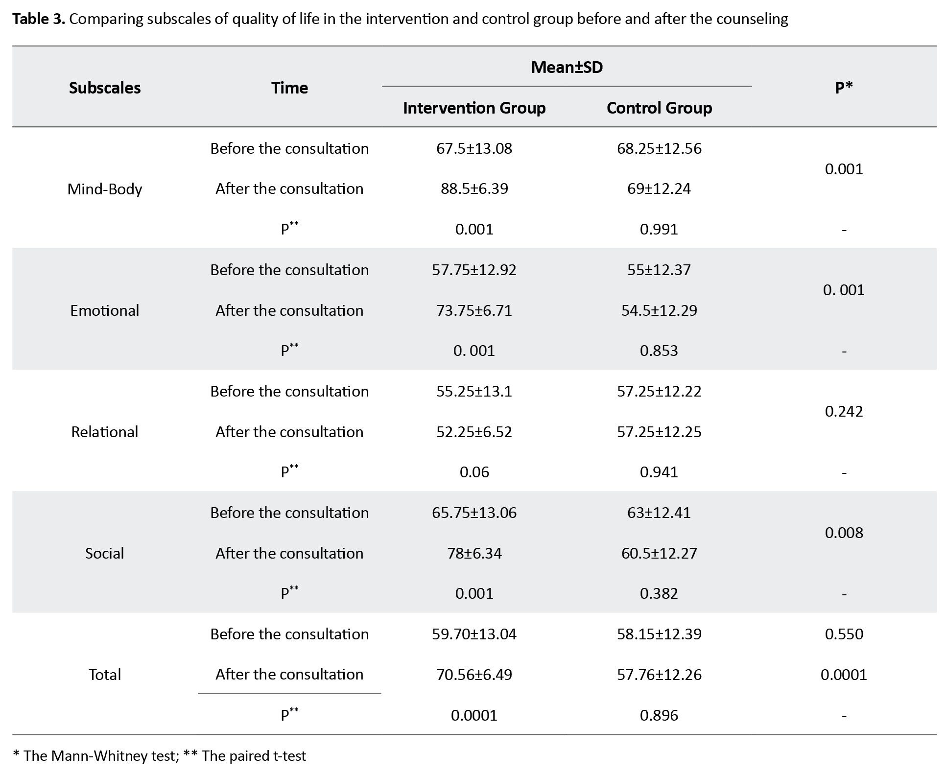 Statistical analysis results showed that the subscales of the mind-body, social, and emotional quality of life improved following infertility counseling in the intervention group (P=0.001), but it did not change in the relational subscale (P=0.060). There was no change in these subscales in the control group (