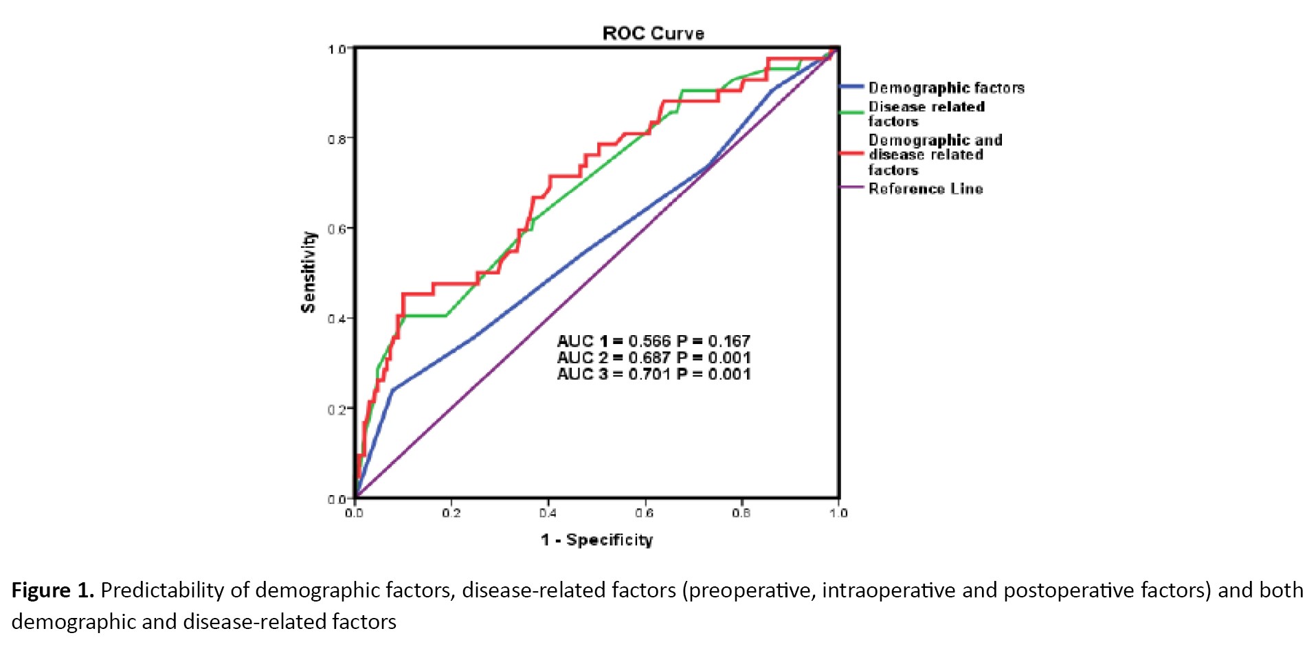 Thus, 6.6% of demographic factors, 18.7% of disease-related factors, and 30.1% of both demographic and disease-related factors were associated with the risk of falling after CABG. The ROC (Receiver Operating Characteristic Curve) was used to determine the relationship of demographic factors, disease-related factors (preoperative, intraoperative, and postoperative factors), and both demographic and disease-related factors. Area Under Curve (AUC) was not significant for demographic factors alone (P=0.1, AUC=0.566), while it was significant for disease-related factors (P=0.001, AUC=0.687) and demographic and disease-related factors together (P=0.001, AUC=0.701) (