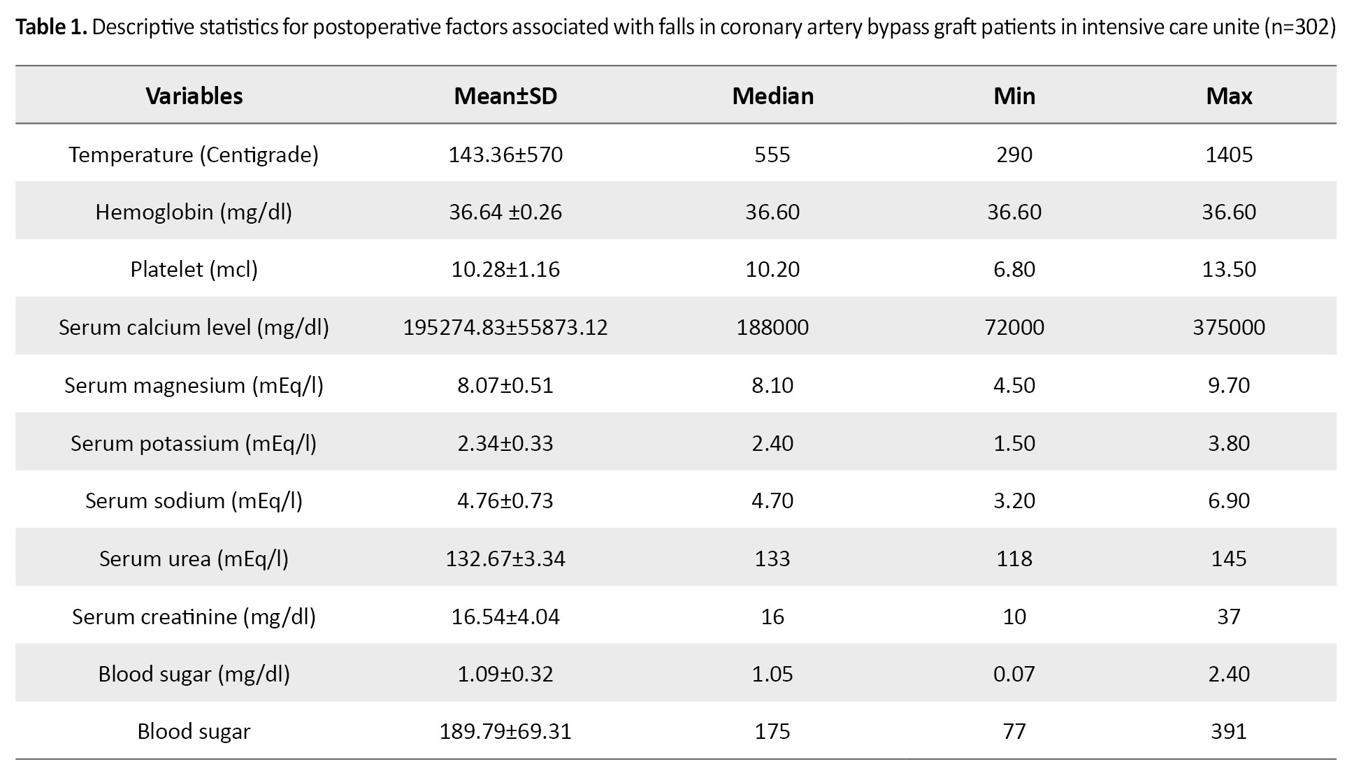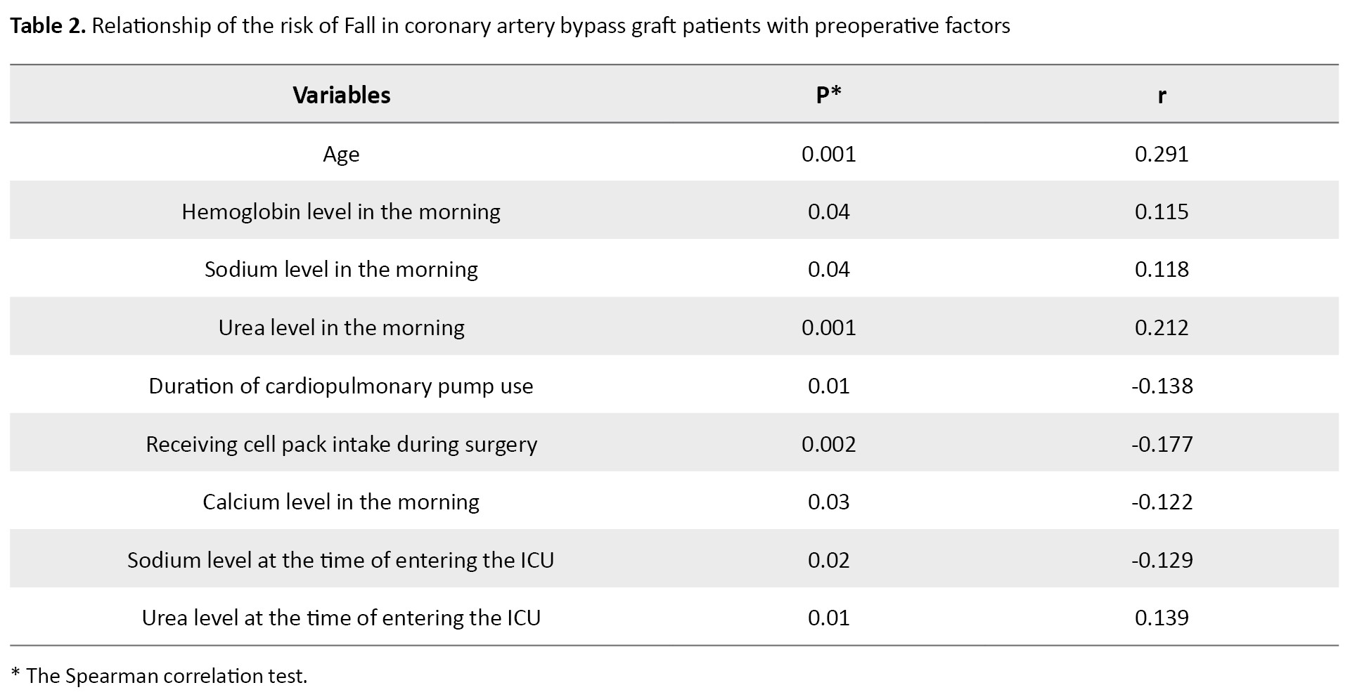 The Spearman test showed that the risk of falls after CABG and transfer from ICU to cardiac surgery ward had a significant relationship with age (P=0.001, r=0.291), hemoglobin level (P=0.04, r=-0.115), sodium level (P=0.04, r=-0.118), urea level (P=0.001, r=0.212), and calcium level (P=0.03, r=-0.122) all in the morning of surgery as well as the duration of cardiopulmonary pump use (P=0.01, r=-0.138), receiving cell pack intake during surgery (P=0.002, r=-0.177), sodium level at the time of entering the ICU (P=0.02, r=-0.129), and serum urea level at the time of entering the ICU (P=0.01, r=0.139) (