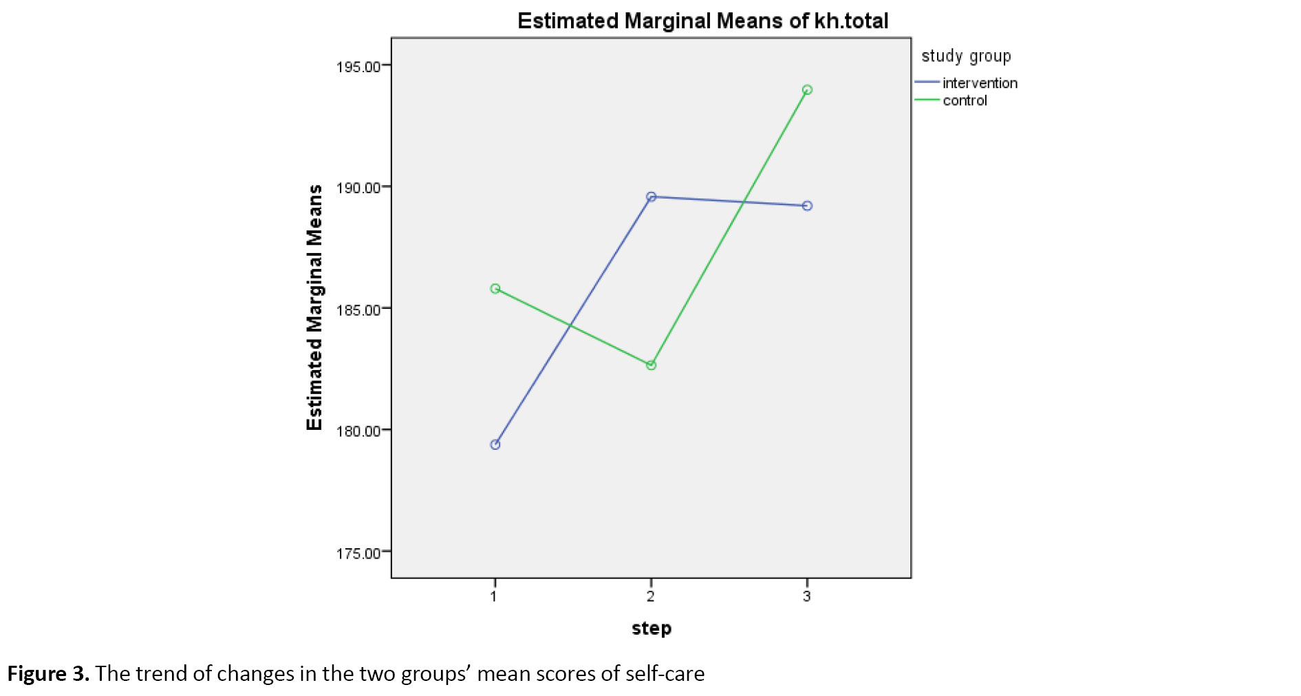 The repeated measures ANOVA also showed a significant difference between the two groups regarding changes in the mean self-care scores during pregnancy (