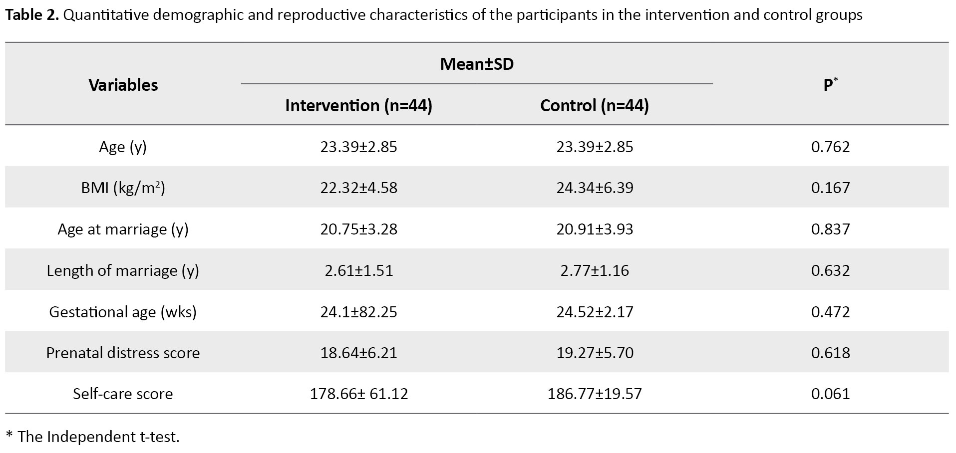 The study data were collected from both groups across three time points, i.e., baseline, after the routine individual counseling or the intervention (last counseling session), and one month later. Data analysis was performed based on the two primary objectives of determining the changes in the mean score of self-care and prenatal distress dimensions before, after, and one month after the intervention in both study groups. The statistical analyses were performed in SPSS v. 21 using the Chi-square test and Fisher exact-test for the qualitative variables. Data normality was reviewed using the Kolmogorov-Smirnov test. All variables have a normal distribution. Then, the data were analyzed using the t-test and repeated measures analysis of variance (ANOVA). The priori level of significance was set at 0.05. The statistical analyses were performed with a per-protocol approach. The statistical analyses were performed in SPSS v. 21.