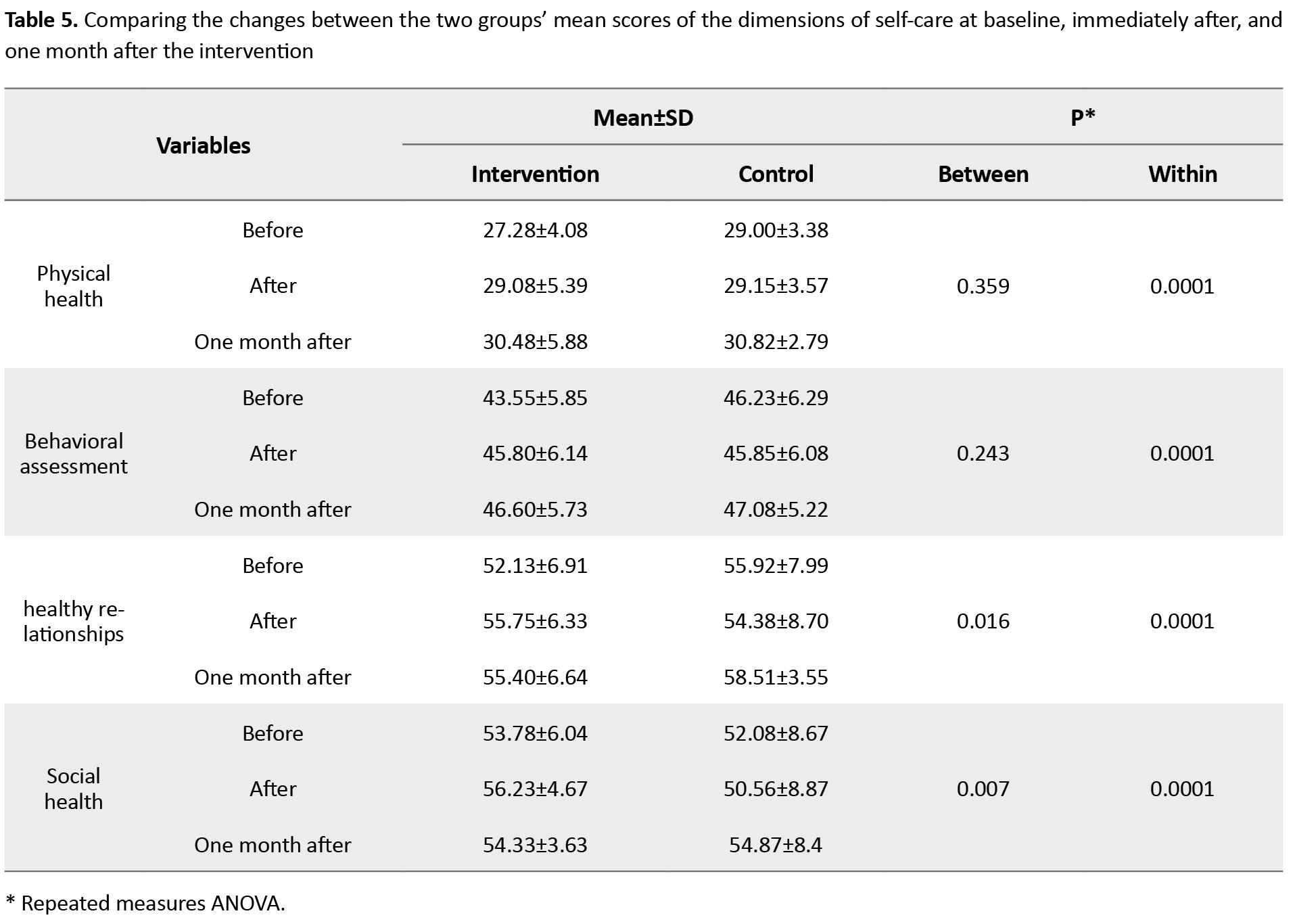 The repeated measures ANOVA revealed statistically significant (P=0.0001) differences between the intervention and control groups with respect to the trend of changes in the mean scores of physical health, behavioral assessment, healthy relationships, and social health dimensions of self-care across the three time points; baseline, after the intervention, and one month later (