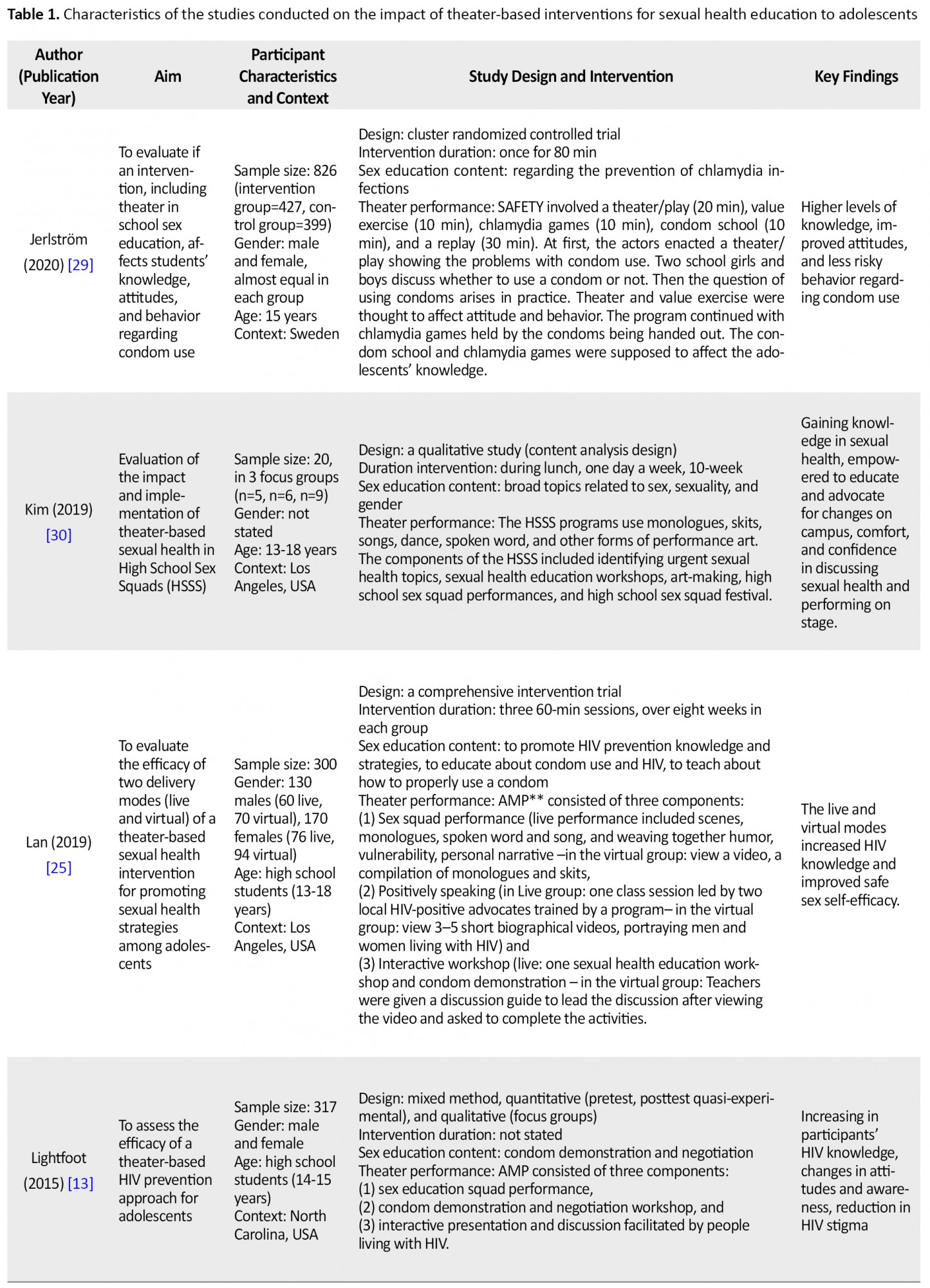 33]. This study aimed to deliver a detailed summary of all the available primary research for determining the theater-based methods, sex education contents, and outcomes in theater-based interventions for sexual health.