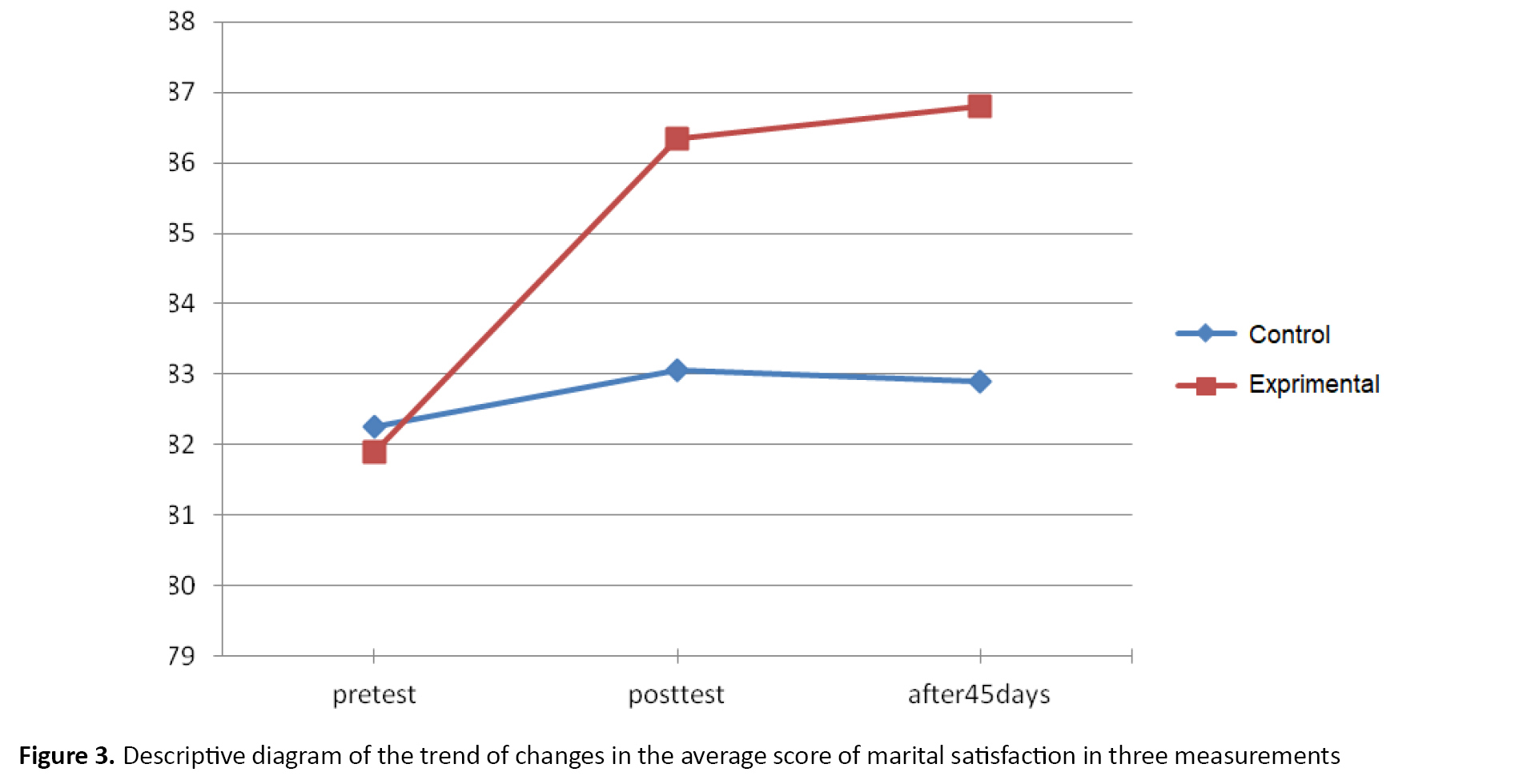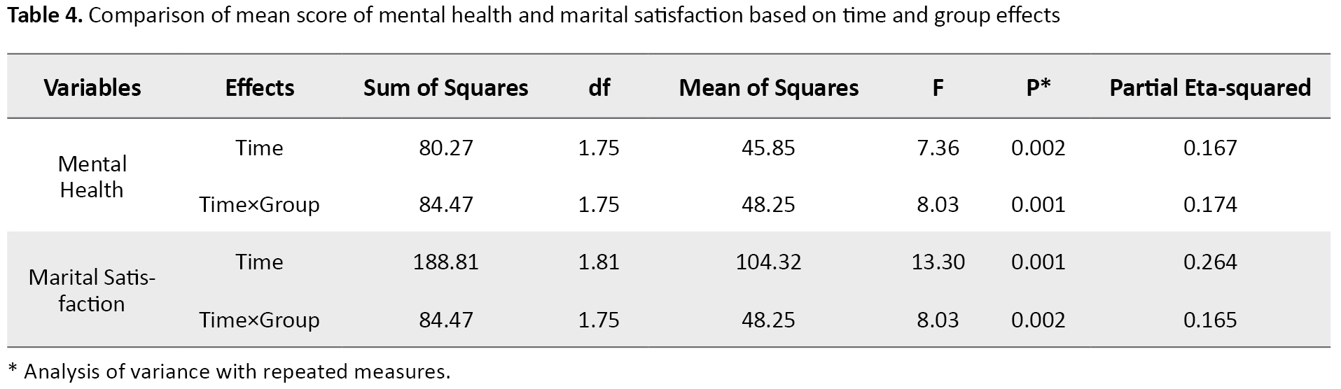 Time significantly affects the changes in mental health (P=0.002) and marital satisfaction (P=0.001) in the samples. Because the time-group effect also shows a significant change for both variables (partial eta-squared for mental health=0.174 and marital satisfaction=0.165), the changes in the mean mental health and marital satisfaction of the participants are not the same between the experimental and control groups; there are changes in the mean score of the two variables in three times. The mean changes of the two variables over time show that the mean scores of mental health in the experimental group in the pretest, posttest, and follow-up had a decreasing trend (43.95±4.38, 41.20±5.73, and 40.25±5.88, respectively). However, the mean scores of marital satisfactions in the experimental group had an increasing trend in three stages of measurement (81.90±7.18, 86.35±8.16, and 86.80±7.96, respectively) (