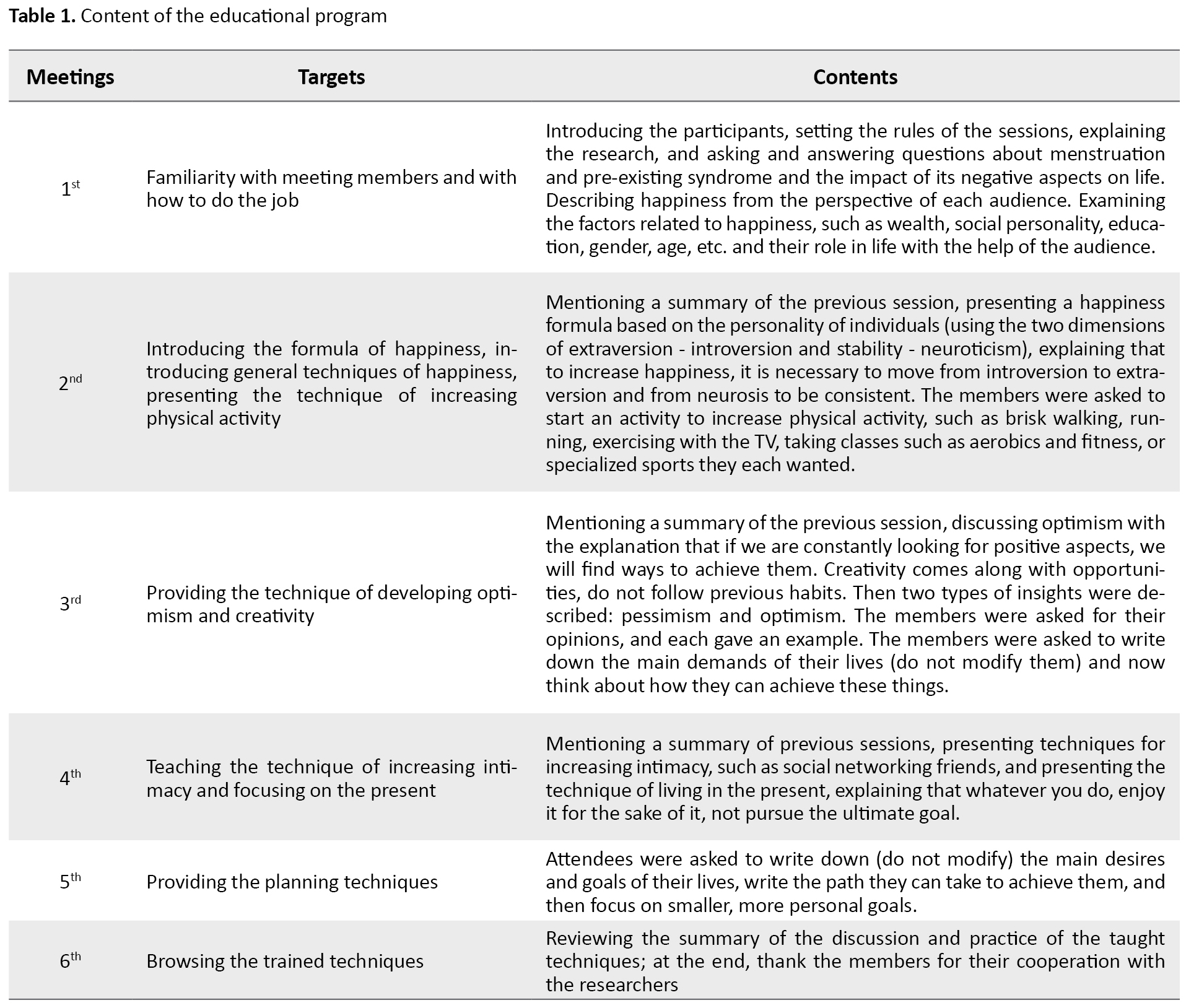The training process in the experimental group was based on teaching the principles of happiness by the Fordyce method (including 8 cognitive principles and 6 behavioral principles, as mentioned), using lectures, group discussions, and questions and answers in six weekly sessions of 60-90 minutes. The content of the educational program of the present study is presented in