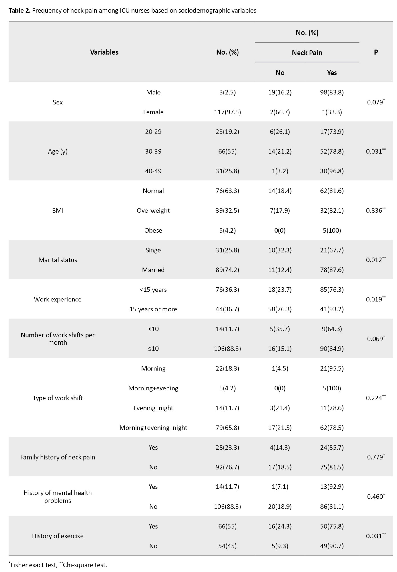 Table 2 showed that the prevalence of neck pain was not significantly different based on sex, BMI, number of work shifts per month, type of work shift, family history of neck pain, or history of mental health problems; however, it was significantly different based on age (P=0.031), marital status (P=0.012), work experience (P=0.019), and history of exercise (P=0.031).