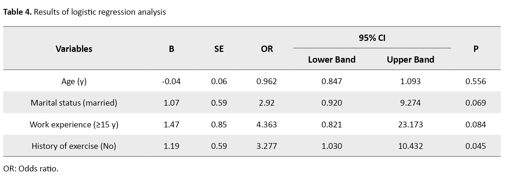 Among the parameters of age, marital status, work experience, and history of exercise, only the history of exercise was significant predictor of neck pain in nurses. In nurses who had no history of exercises, the risk of neck pain was 3.277 times higher than in nurses with a history of exercise (OR=3.277, 95% CI; 1.30%, 10.43%, P=0.045). But at a significance level of 0.1, marital status and work experience were also independent predictors of neck pain in nurses, so that compared to single nurses, the risk of neck pain in married nurses is 2.92 times higher (OR=2.92, 95% CI; 0.9%, 9.3%, P=0.069) in borderline manner.