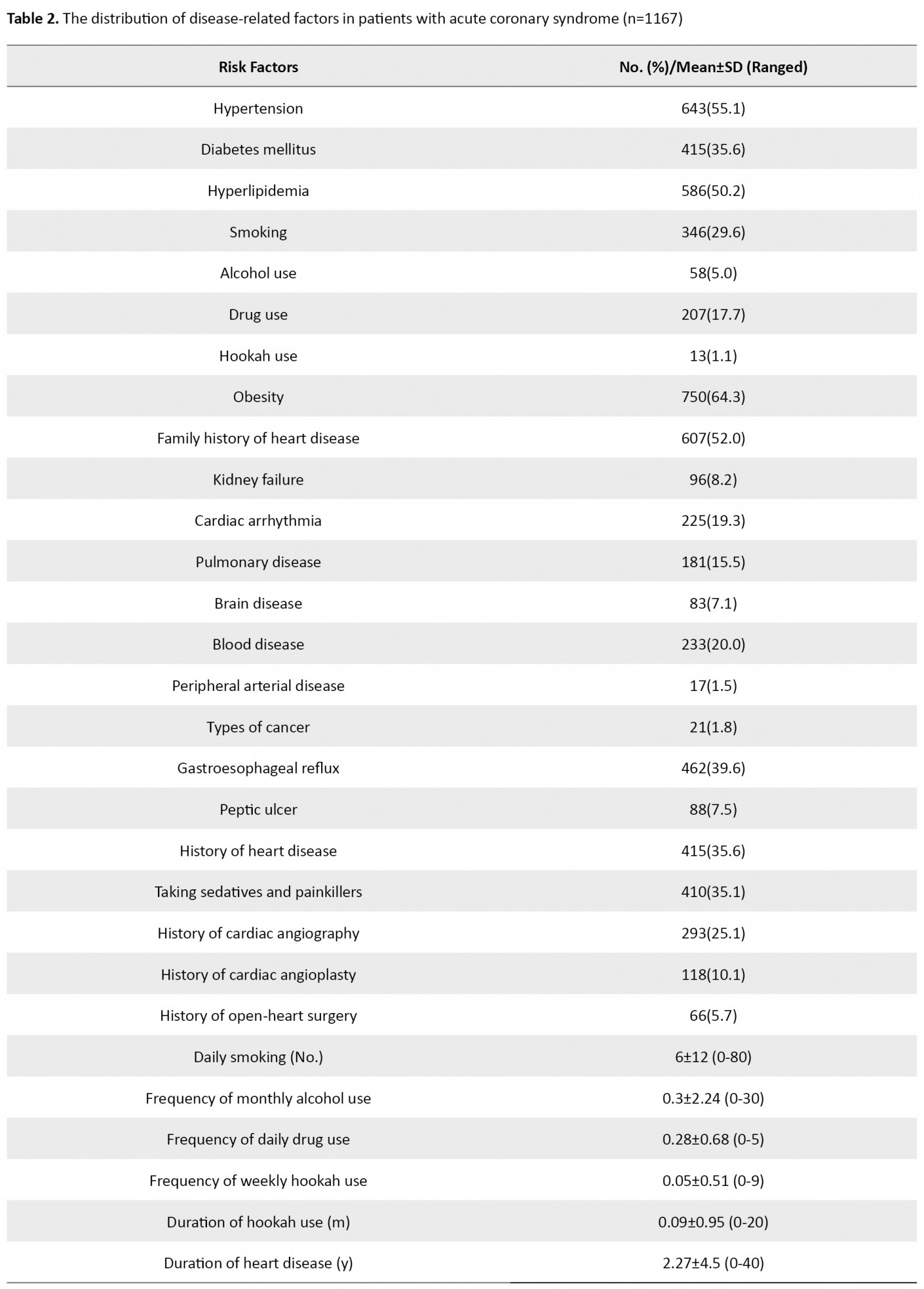 The inclusion criteria included hospitalization with a diagnosis of ACS (including ST-elevated acute myocardial infarction, non-ST-elevated acute myocardial infarction, and unstable angina) based on the diagnosis recorded in the medical record by the cardiologist, being 18 years and older, having a consent form to participate in the study, having the ability to communicate verbally and understand Persian language, having clinically stable conditions to answer questions, obtaining the minimum score in the Mini-Mental State Examination (MMSE) in patients older than 65 years, and having stable physical conditions (within the second 24 hours).