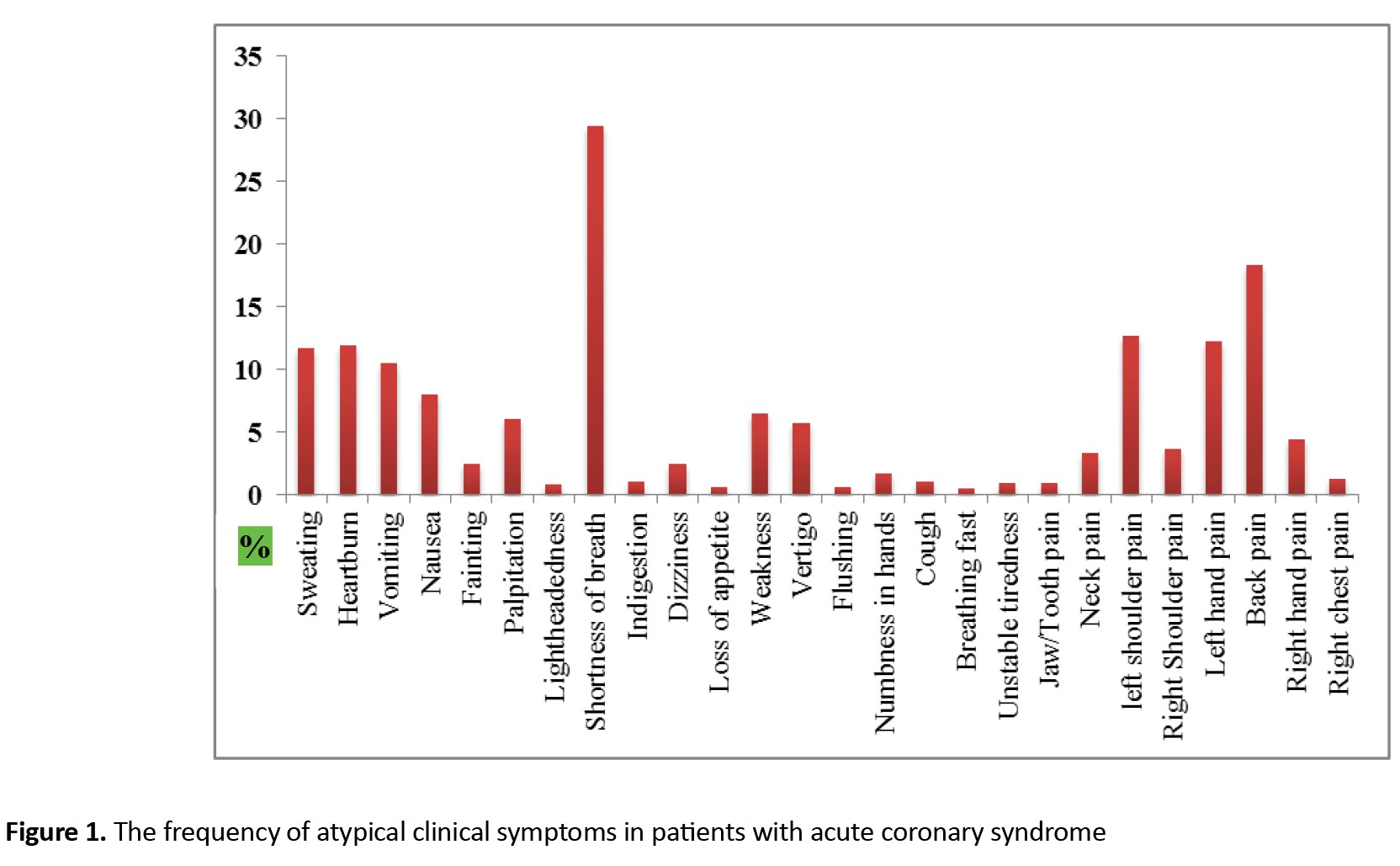 In the present study, the most atypical clinical symptoms reported by the patients were shortness of breath (29.4%), back pain (18.3%), left shoulder pain (12.7%), and left-hand pain (12.3%), respectively (