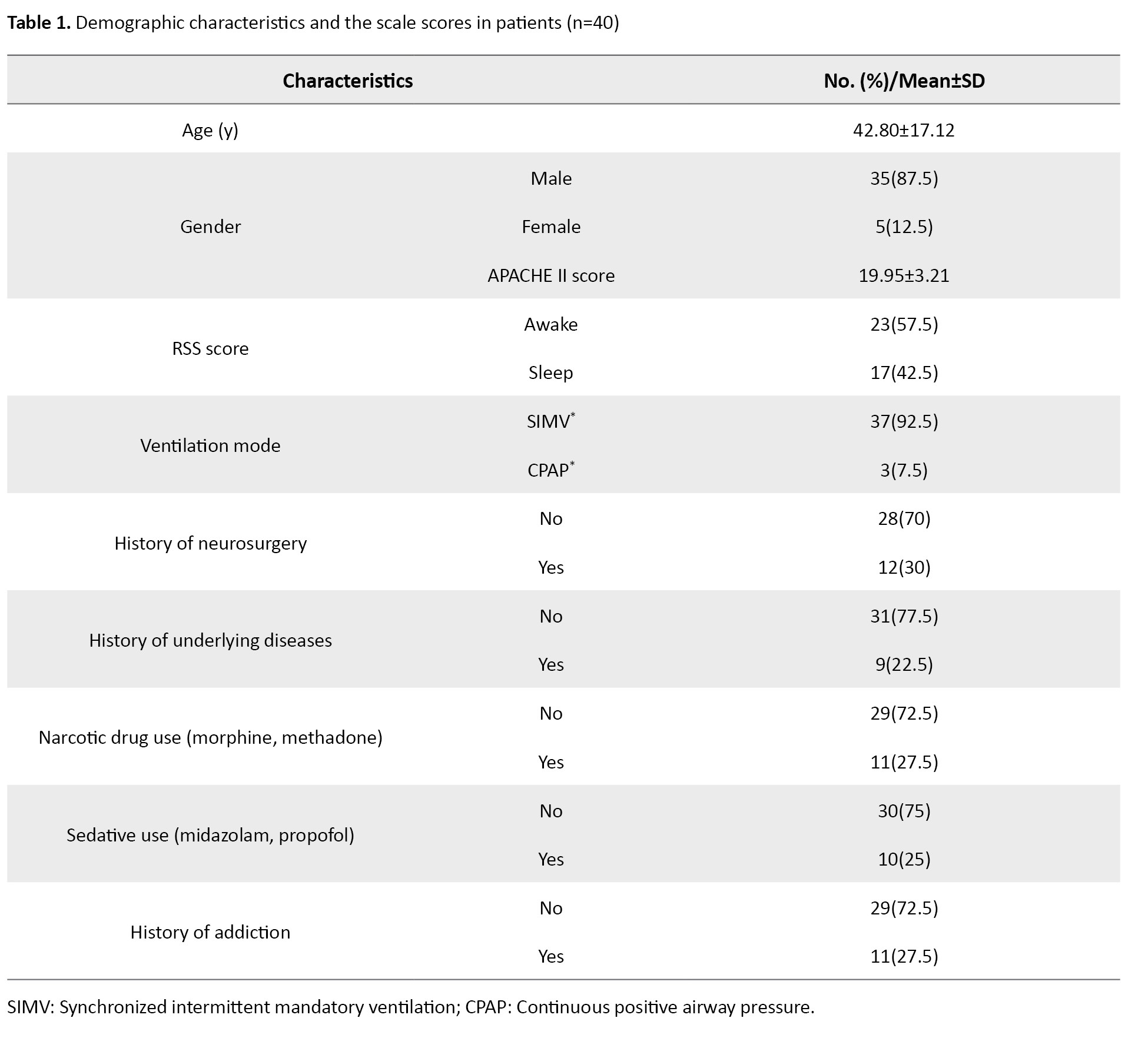 This cross-sectional study was conducted on 40 intubated patients under mechanical ventilation at the trauma ICU of a hospital in Sabzevar, Iran. Data collection was performed using an observational approach from November 2020 to May 2021. The samples were selected using a convenience sampling method. The minimum sample size was determined 26, according to a pilot study, and considering the correlation coefficient of 0.74 between pain and APACHE II scores and β=80% at a confidence interval of 0.95. Due to the possibility of 50% sample dropout, the sample size was increased to 40. The inclusion criteria were age ≥18 years, a Glasgow coma scale (GCS) score of 5-8, having an artificial airway, and undergoing mechanical ventilation for more than 48 hours. The exclusion criteria were death in the first 24 hours, extubation, and transferring to other wards.