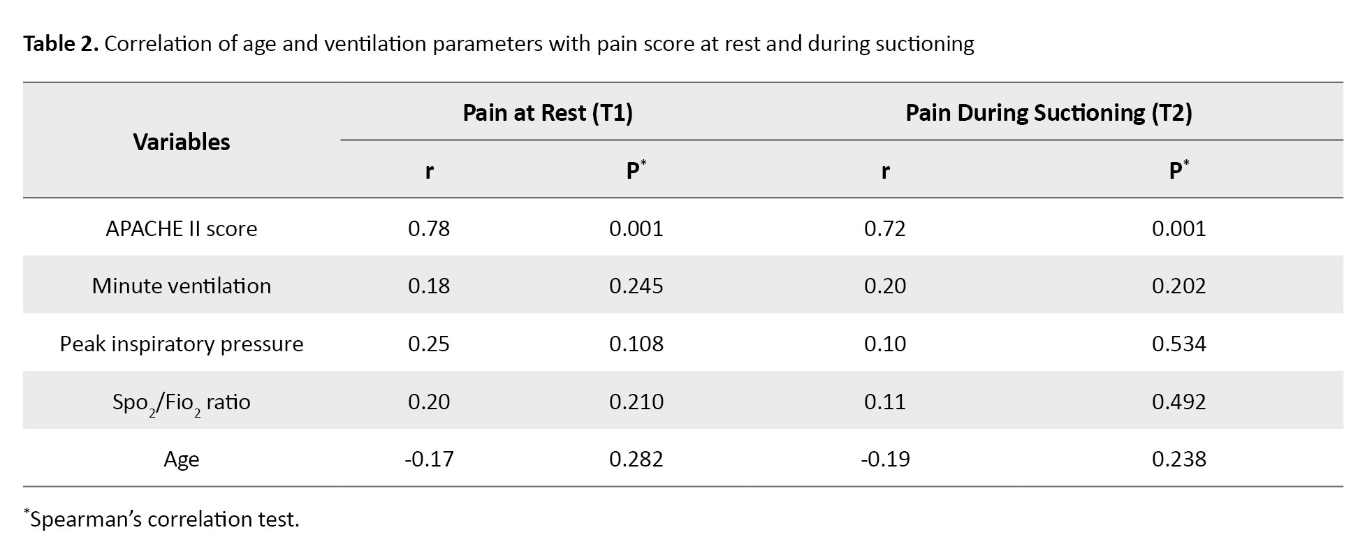 Table 2) indicated a significant correlation between the APACHE II scores at T1 (r=0.78) and during suctioning or at T2 (r= 0.72, P=0.001).