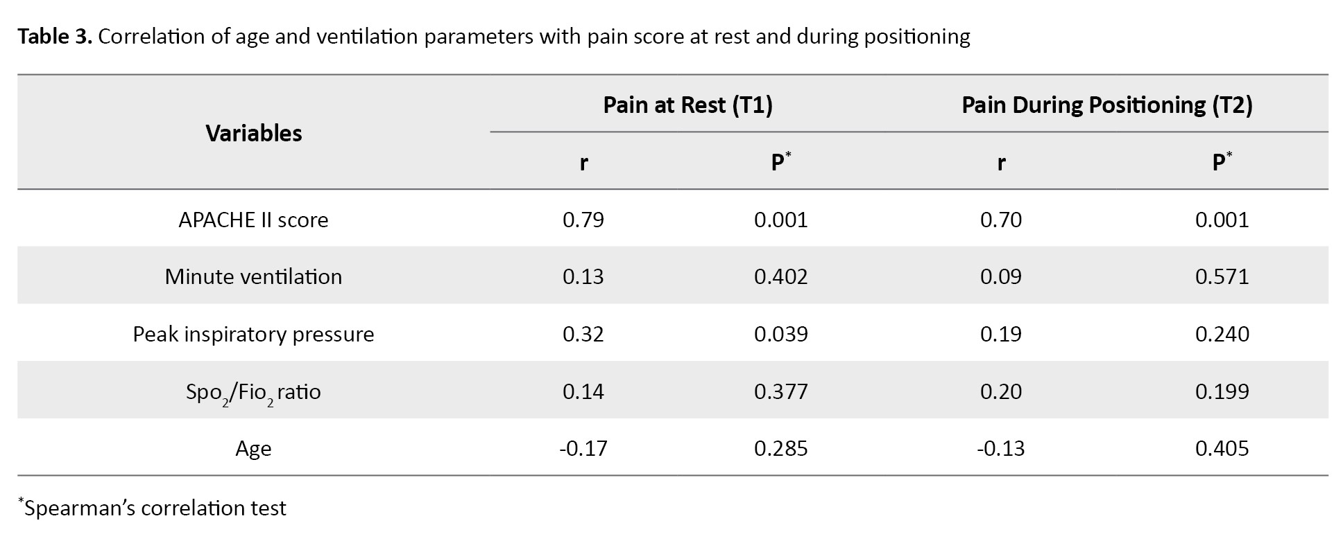 The results of the present study indicated no significant correlation between the pain intensity and ventilation parameters. This can be due to the fact that the majority of the patients were receiving the synchronized intermittent mandatory ventilation, and they were only monitored on the first three days of ICU admission. In this short period, the patients did not experience diminished respiratory capacities. Moreover, respiratory indicators such as minute ventilation and Spo2/Fio2 ratio showed that the severity of respiratory failure was mild. These findings are consistent with the results of Wojnar-Gruszka et al. They concluded that there is no relationship between ventilator parameters and the CPOT score [