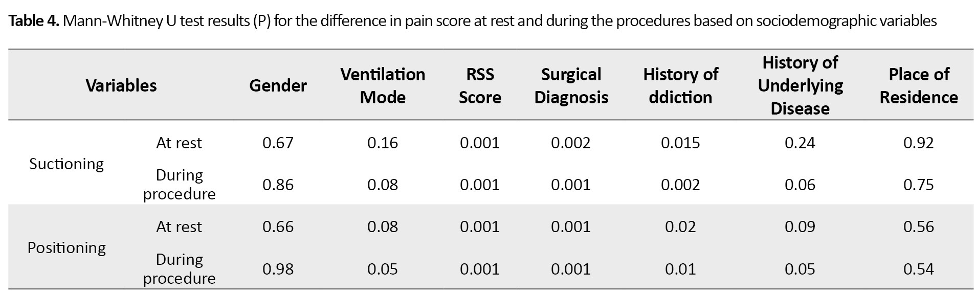 In addition, the Mann-Whitney U test showed that patients with lower sedation scores experienced higher pain levels (P1=0.001, P2=0.001). Ten patients received sedation before the painful procedures of suctioning and position change, and their mean scores during the procedures were 4.56±1.3 and 4.55±1.33, respectively, while 30 patients did not receive sedation and their scores were 24.48 and 24.58. In total, 25% of the patients (n=10) were sedated one hour before undergoing painful procedures, and 27.5% (n=11) were administered with narcotic drugs one hour before undergoing painful procedures. No significant correlation was observed between narcotics use and pain intensity at T1 and T2. However, the Mann-Whitney U test results showed that the pain levels before (P<0.001) and during (P<0.001) procedures were significantly lower in the patients administered with sedatives.