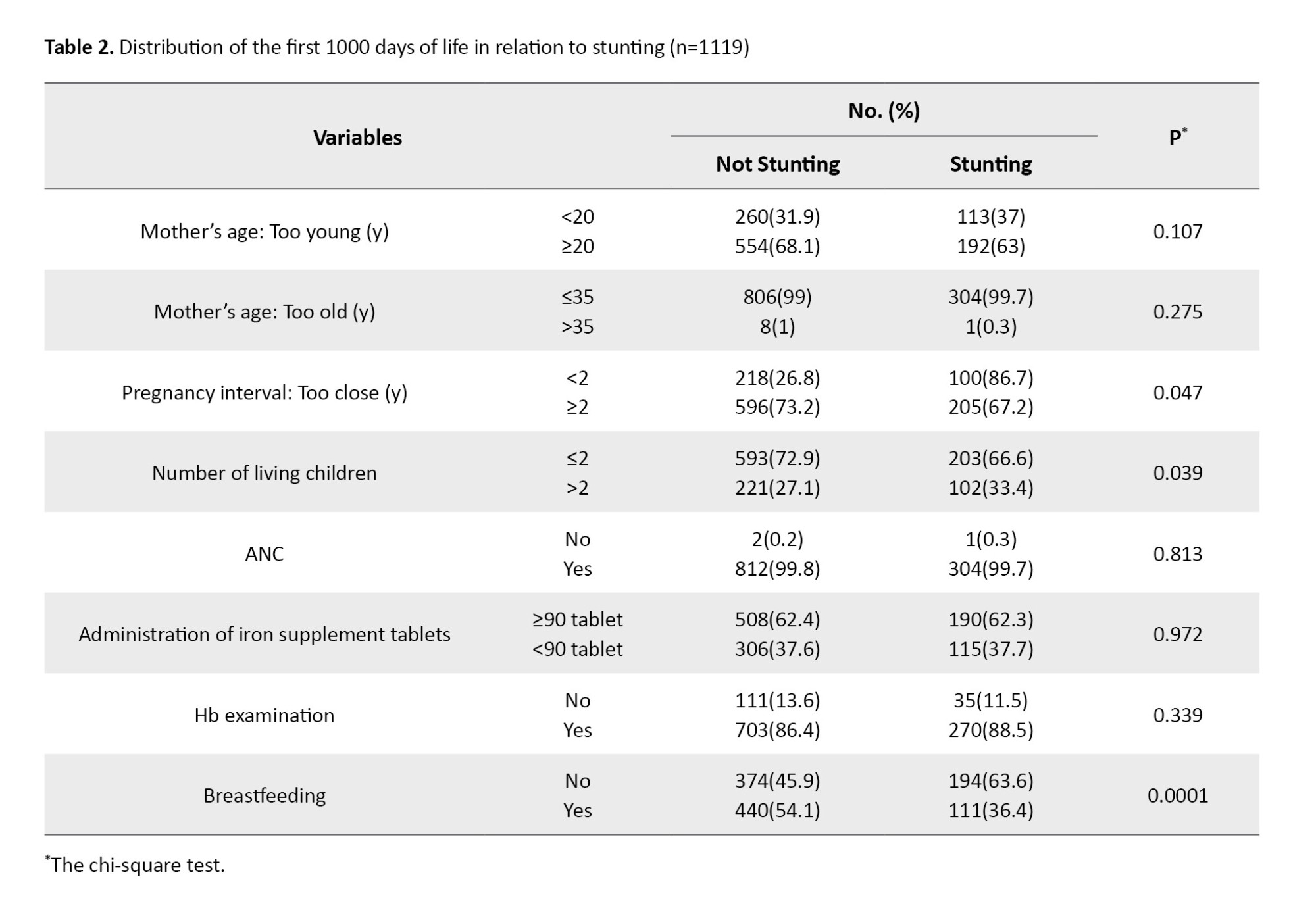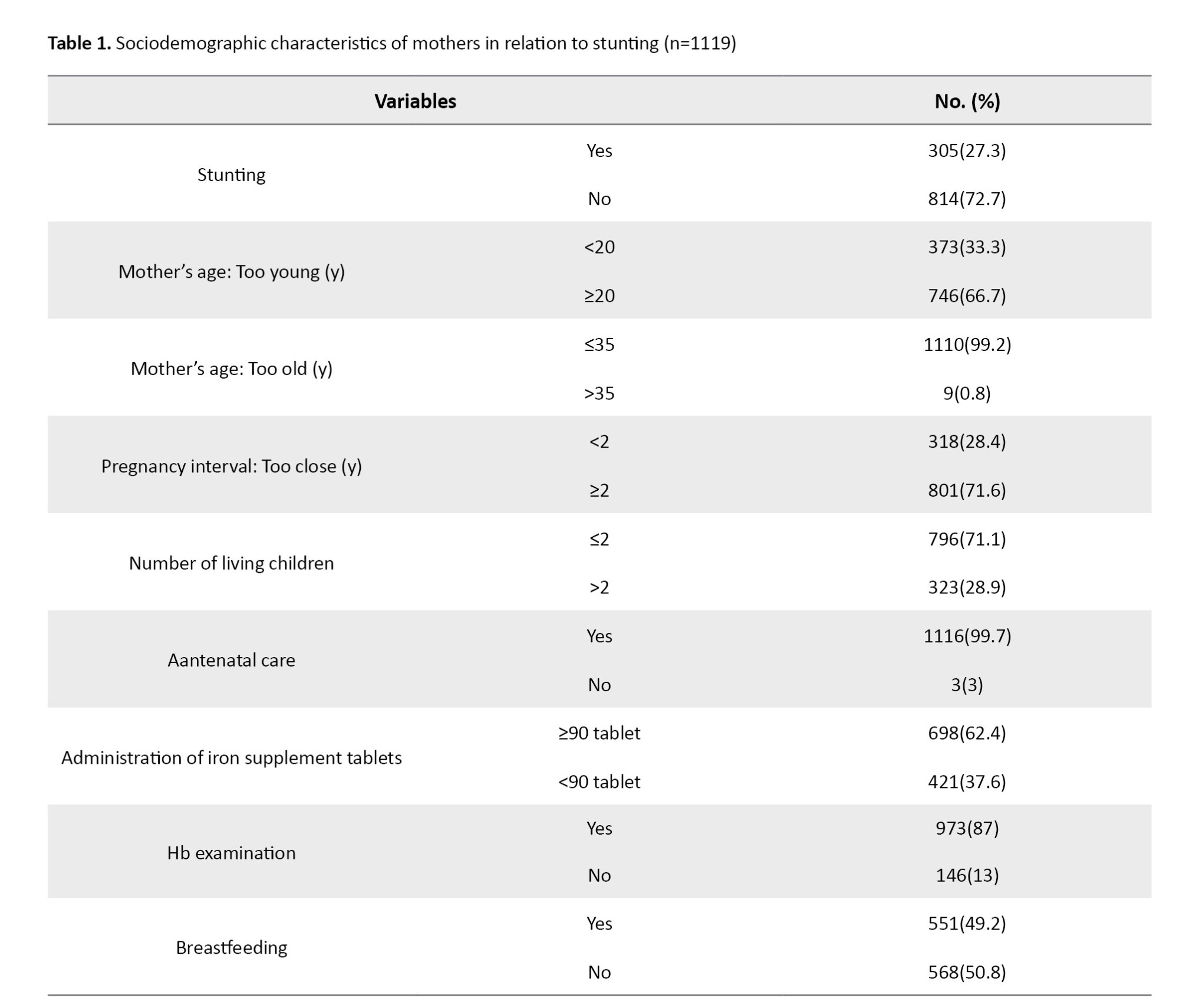 Based on the characteristics of the research subjects, of the 1119 toddlers (aged 0-59 months, 814(72.7%) did not experience stunting. The characteristics of the mothers showed that most were aged ≥20 years (66.7%) and aged ≤35 years (99.2%). Only 33.3% of mothers were <20 years old, and 0.8% were aged >35 years. The pregnancy interval was mostly ≥2 years (71.6%), and most mothers had ≤2 living children (71.1%). Most pregnant mothers also showed involvement in pregnancy services, with 99.7% making ANC visits, 87% undergoing Hb level checks, and 62.4% consuming ≥90 iron tablets. However, more than half of the mothers (50.8%) did not provide breast milk to their children. These data describe sociodemographic conditions during pregnancy, which are potential factors for stunting in toddlers, as detailed in Table 1.