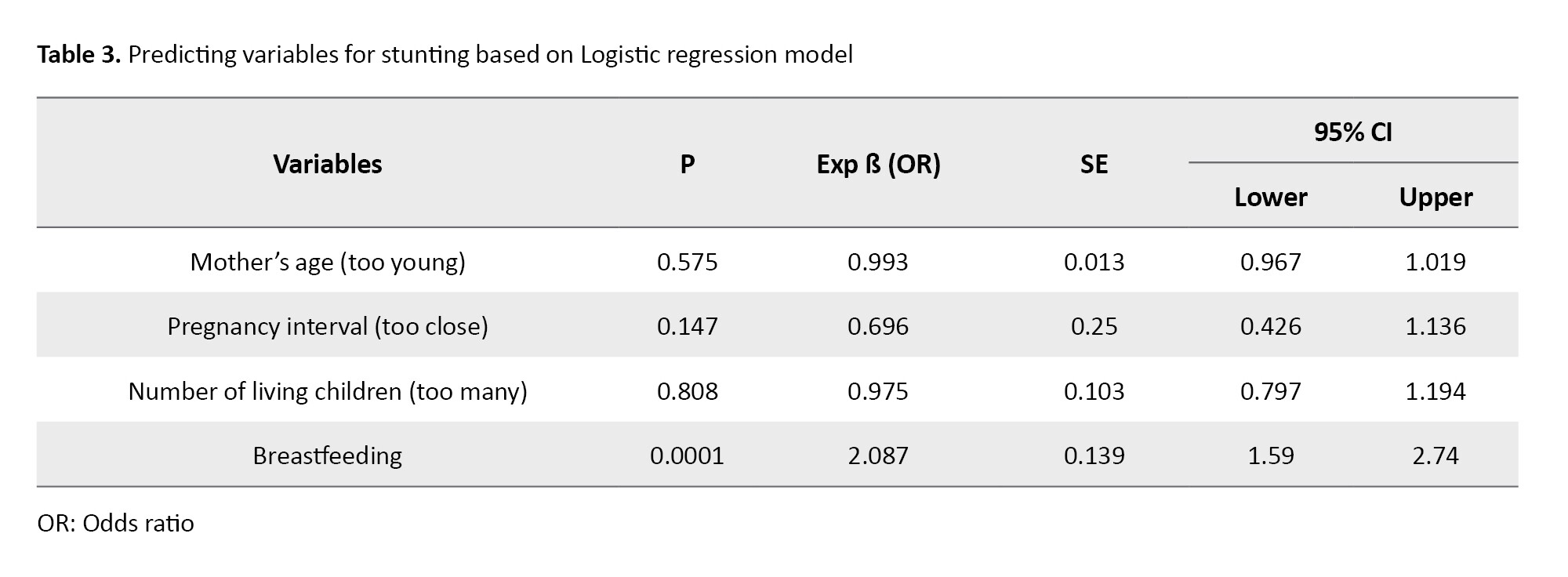 After that, we included variables with P<0.25 in the logistic regression model. Based on the binary logistic regression model (Table 3), the dominant factors in the incidence of stunting show that of the four variables entered into the model, only breastfeeding has a statistically significant effect on the incidence of stunting (P<0.05). The breastfeeding variable shows a statistically significant relationship to the incidence of stunting (OR=2.087, 95% CI; 1.590, 2.740, P=0.0001). This finding shows that toddlers who do not get breast milk are 2.08 times more likely to experience stunting than toddlers given breast milk after being controlled with other variables in the model. Meanwhile, the variable of too-close pregnancy spacing (<2 years) shows that it is not statistically significant in the model. Similarly, the number of living children >2 also indicated that it was not significant.