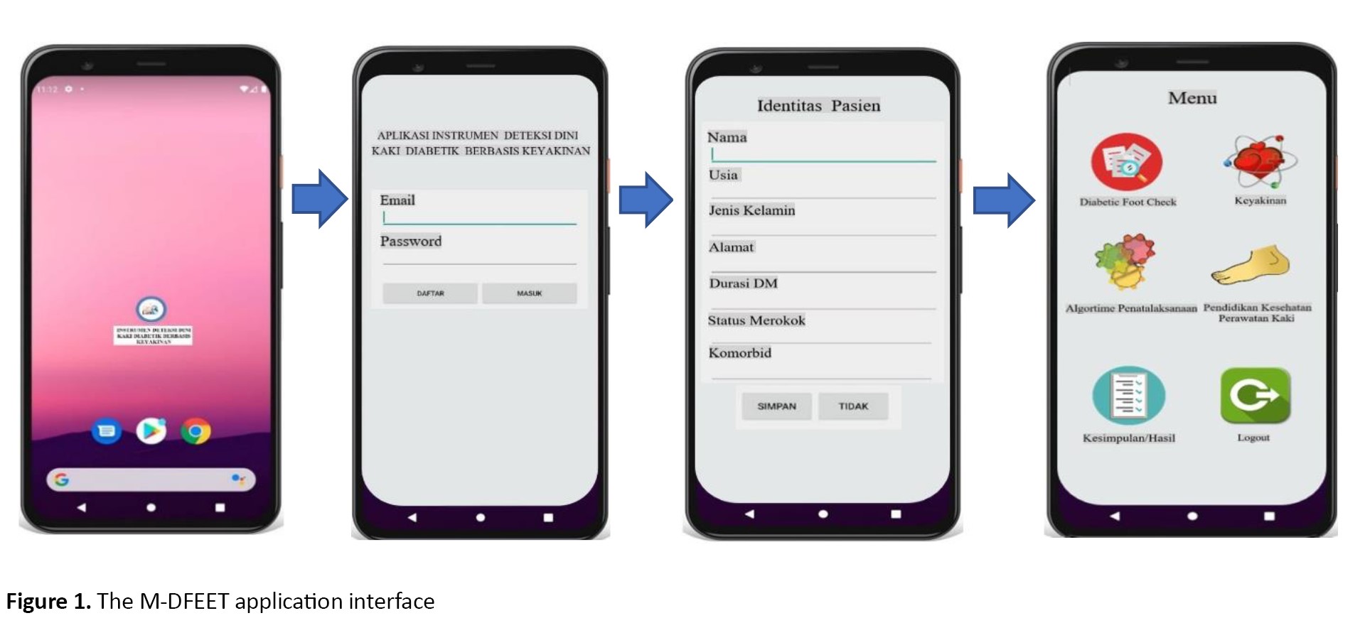 The M-DFEET application uses a theoretical approach that builds trust in patients with type 2 DM, prevent diabetic foot complications, or reduce deaths. The success of controlling the complications of diabetic foot depends on patients’ self-care behaviors since more than 95% of DM-related treatments are done by the patients themselves based on beliefs, ability, and adherence to health guidelines. By the M-DFEET application, diabetic patients can conduct early diabetic foot detection test independently anywhere and anytime. The application also has proper quality based on functionality, reliability, efficiency, usability, and portability. This application is projected to contribute to evidence-based nursing practice to reduce DM-related disability and death. However, the application, which was developed only for Android users and use the Indonesian language, is highly dependent on the stability of the internet connection. Furthermore, the application has yet to be tested extensively with a larger number of participants. In addition, the application needs to be upgraded to be used offline and save data for online processing when internet is reconnected.