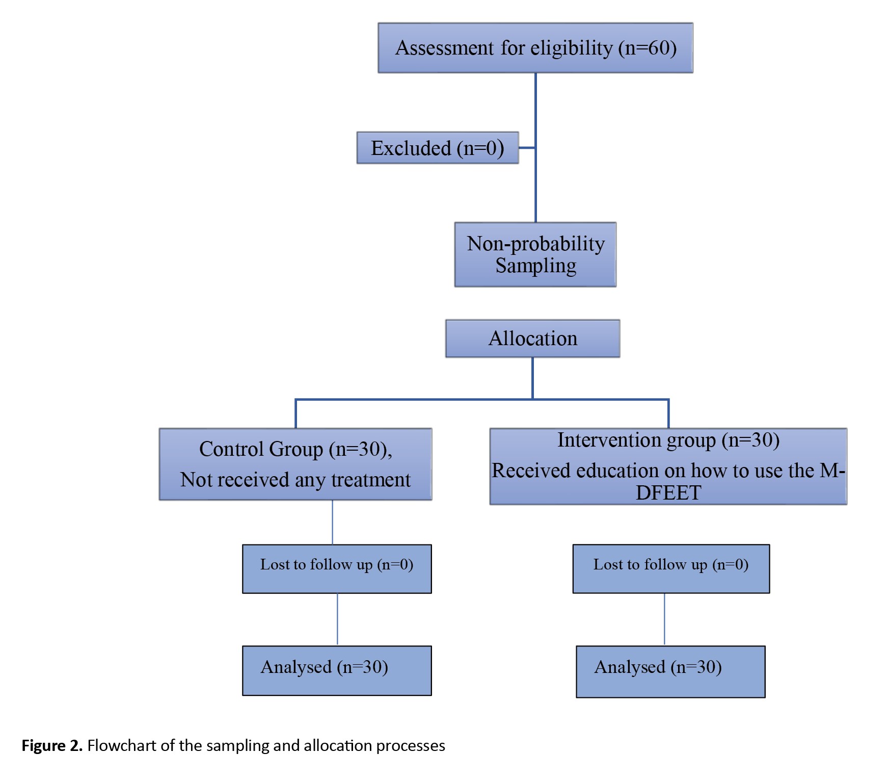 14]. By accounting for a 10% sample dropout rate, the final sample size was 30 per group. In this regard, 60 patients with type 2 DM who met the inclusion criteria were purposively recruited from Puskesmas Blahbatuh Hospital, Gianyar, Bali. The inclusion criteria were a diagnosed type 2 DM, age 30-65 years, no diabetic foot complications, having a smartphone with Android operating system and being able to use these smartphones, attending socialisation and training on the use of the M-DFEET application, and willingness to participate in the study. On the other hand, the patients who already had diabetic foot were excluded. Sample selection was done based on assigning even and odd numbers to patient names. Even numbers were for the inclusion in the control group and odd numbers were for the intervention group. The flowchart of sampling allocation process is shown in