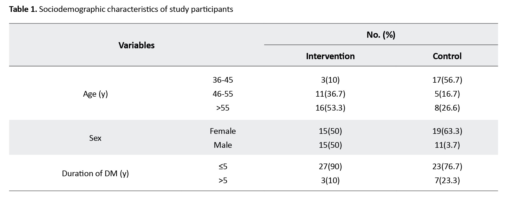 The most of respondents in the intervention group were over 55 years of age (53.3%), while the majority of respondents in the control group aged 36-45 years (56.7%). Regarding gender, the majority of respondents in the control group were female (63.3%) while the percentage of females and males in the intervention group was equal (50%). The majority of respondents had DM for less than 5 years in both intervention (90%) and control (76.7%) group (