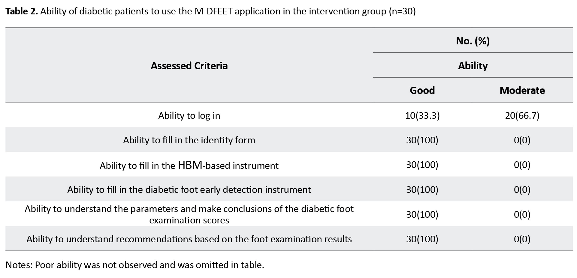The results showed that one third of participants in the intervention group had a good ability to log into the M-DFEET application, while the rest had a moderate ability to log in.