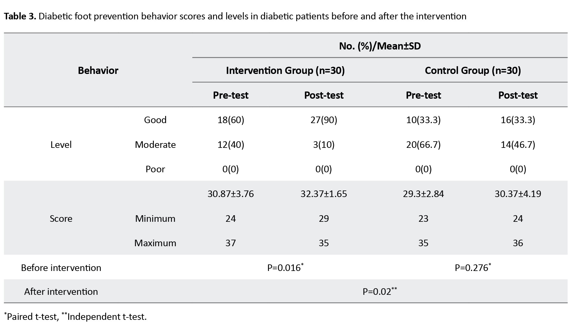 The research team provided socialization and training to the participants in the intervention group regarding the proper use of the application. They were trained to log in, register and fill the questionnaire. Diabetic foot prevention behaviors were measured before using application and three months after using application. The collected data were analysed using descriptive statistics, paired t-test to compare pre-test and post-test scores and independent t-test to measure the difference in the post-test scores between groups.