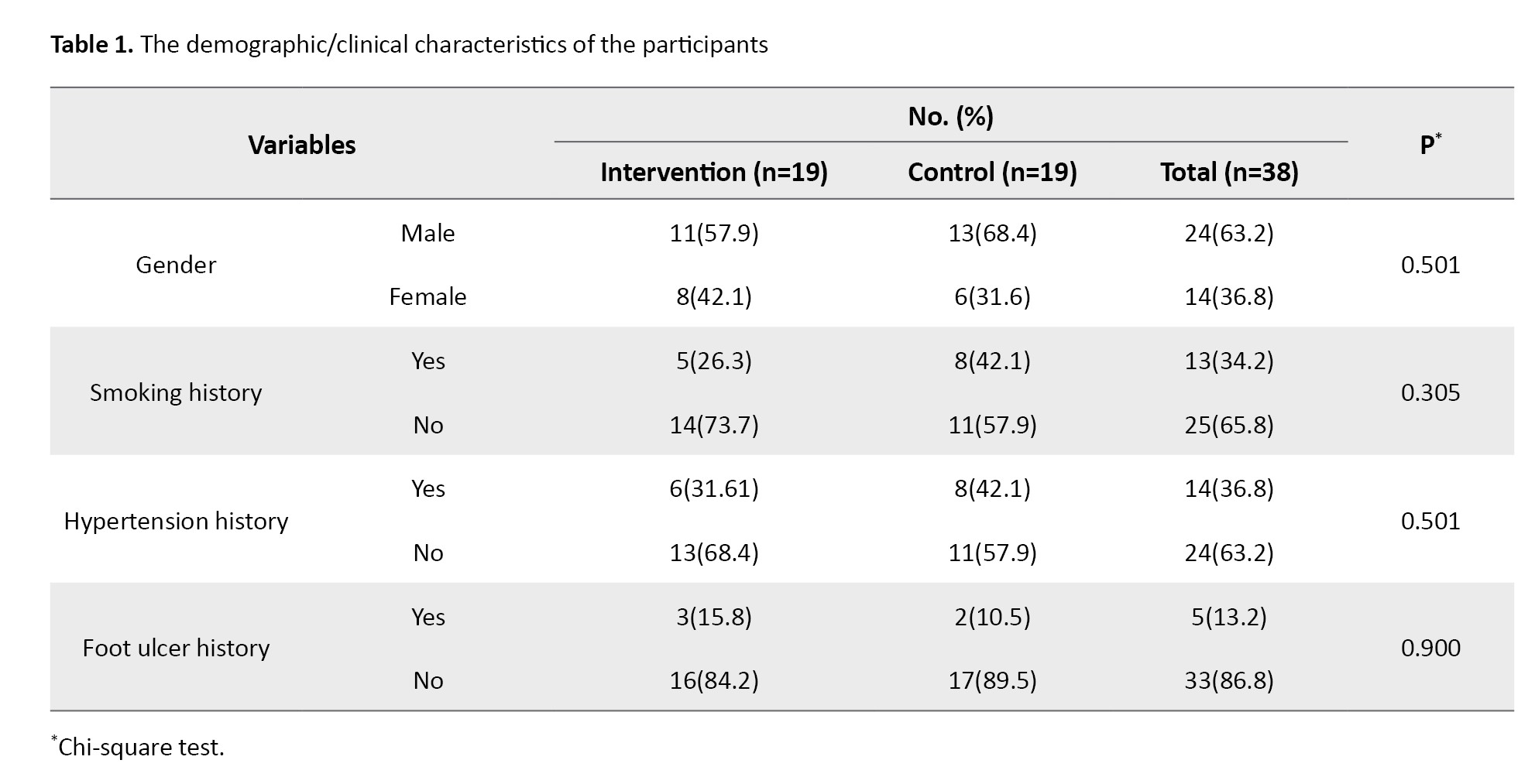 During the research process, none of the respondents experienced injuries or complications from the exercise intervention. The demographic/clinical characteristics of the participants, including gender, smoking history, history of foot ulcers, and history of hypertension, are shown in