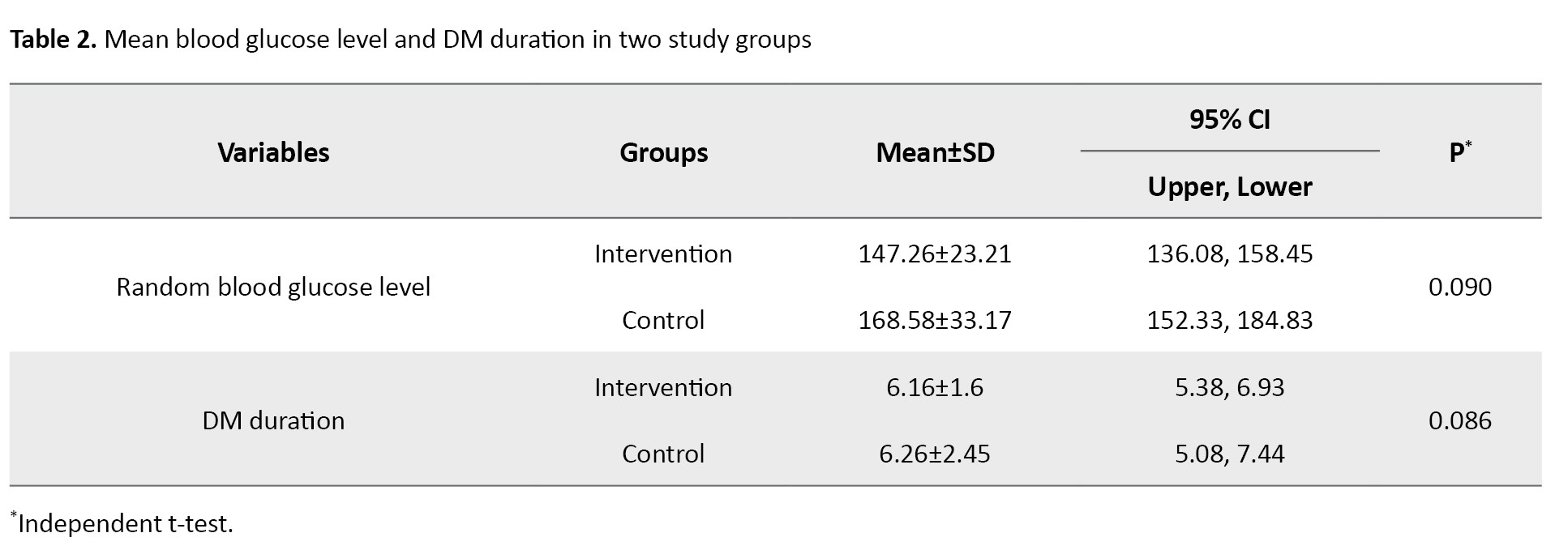 The mean blood glucose level was 147±23.21 mg/dL in the intervention group and 168±33.17 mg/dL in the control group; and had been diagnosed with diabetes for 6 years (intervention and control group).