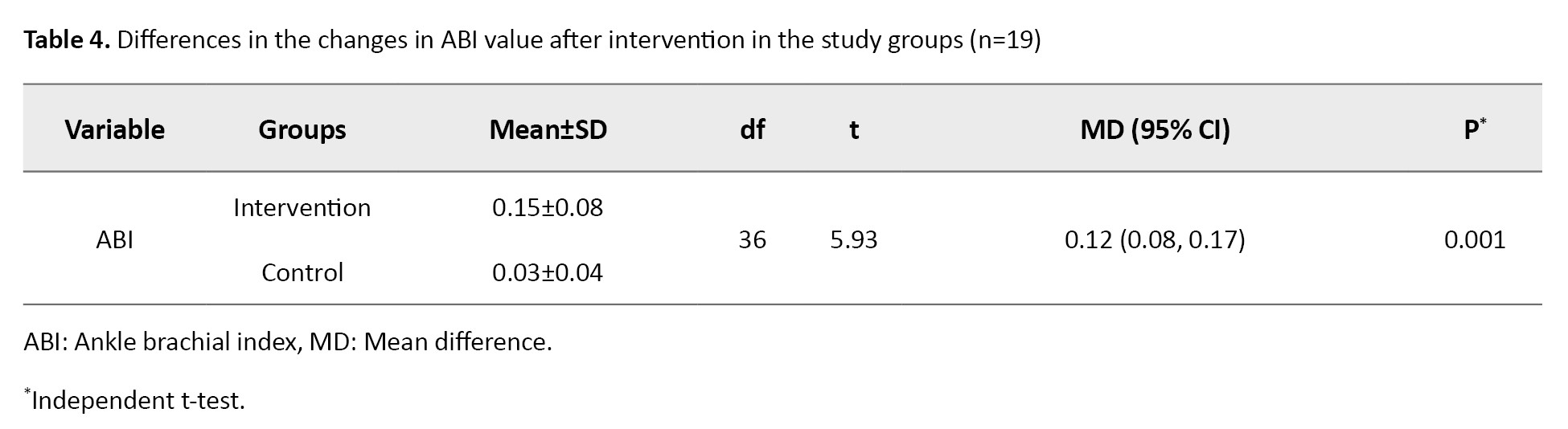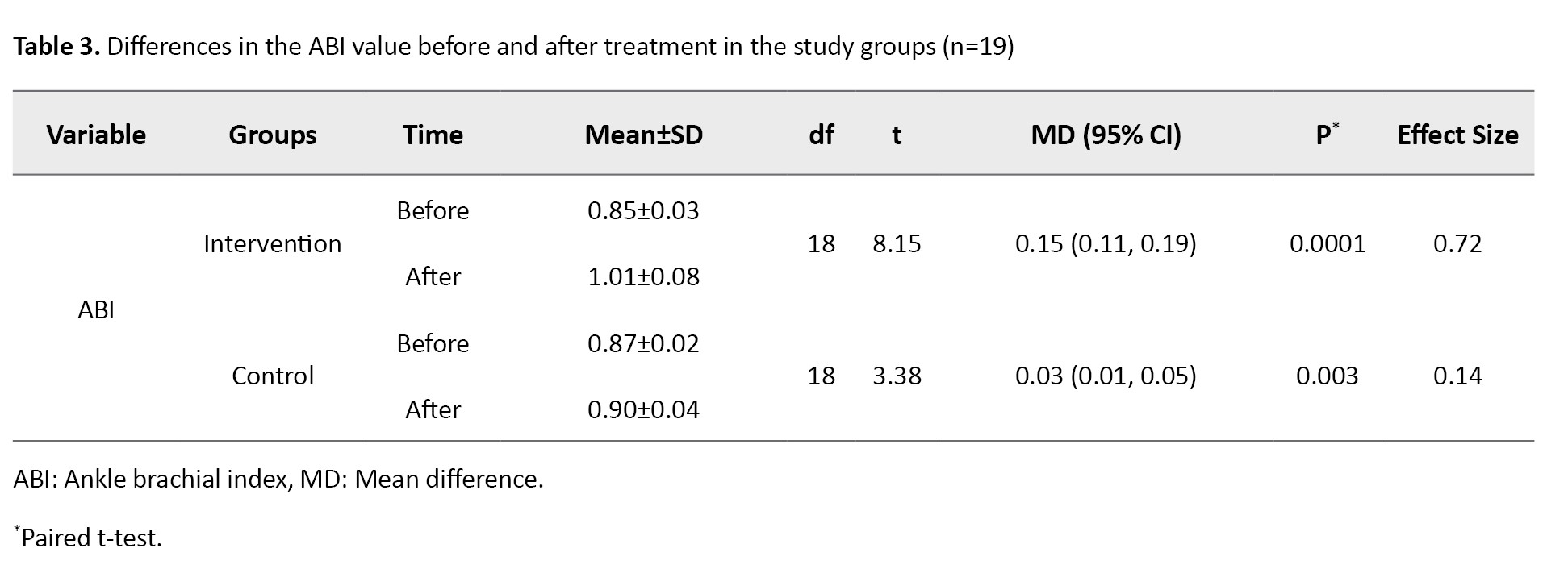The statistical analysis was performed in SPSS software, version 23. frequency and Mean±SD were used to describe the data. Furthermore, differences in the ABI values after treatment between the control and intervention groups were determined using an independent t-test. Differences in ABI values within groups were analyzed using a paired t-test. P<0.05 was considered statistically significant. The data for the normal distribution were tested using the Shapiro-Wilk test. The N-gain score was calculated to assess the effectiveness of therapy based on the ideal ABI value. The multivariate regression analysis was used to find the variables that can predict the changes in ABI values.