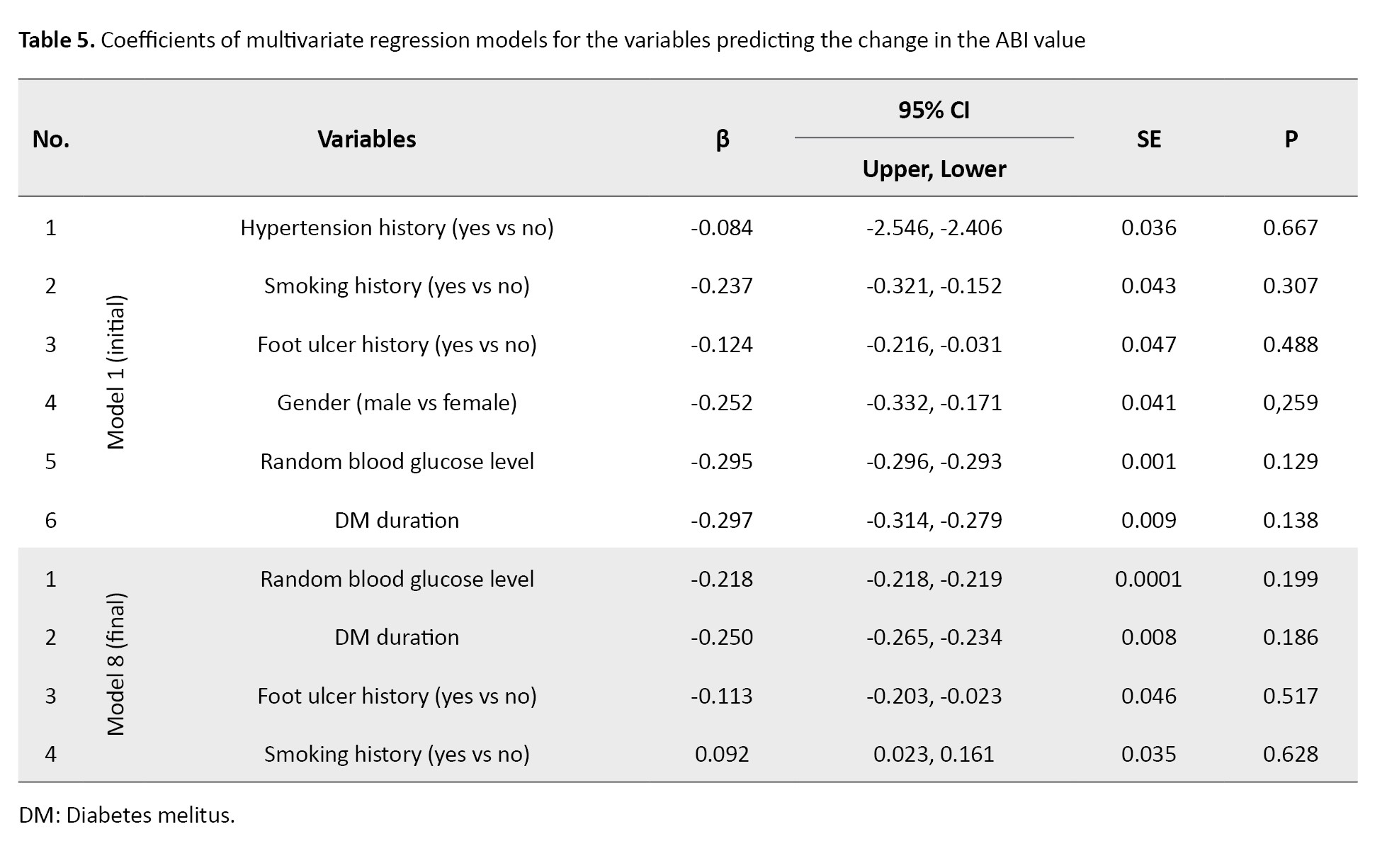 In the final regression model, four confounding variables with a difference >10% in OR during the variable selection process were included. The results showed these four variables (random blood glucose level, DM duration, foot ulcer history, and smoking history) did not have any significant association with the ABI value (P>0.05).