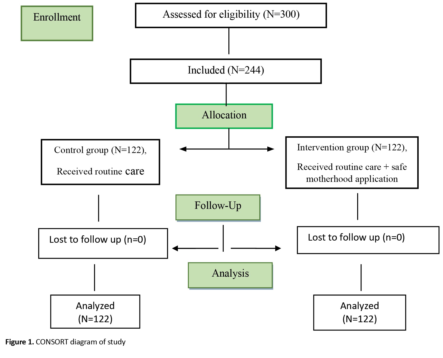 For the intervention group, the safe motherhood application was installed on participants’ Android smartphones by the researcher, and they were trained on how to use it. As mentioned before, it was designed based on the results of our previous study [8]. It consisted of pre-pregnancy training, pregnancy/childbirth training, postpartum training, information about adverse pregnancy outcomes, screening, how to provide care to healthy infants, how to provide care to premature neonates, information about the stages of fetal development, interpretation of tests, and frequently asked questions. The participants in the intervention group received routine care in addition to the educational application. The control group received only routine care. After the interventions, the control group also received access to the educational application to comply with ethical considerations.