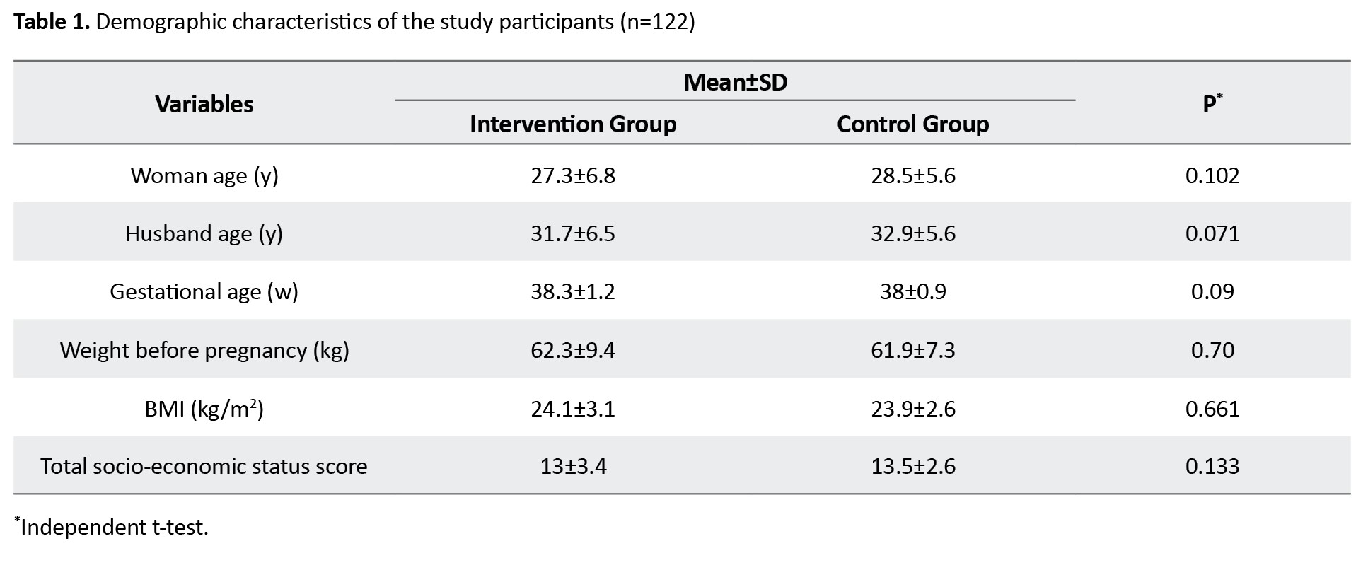 The mean age of the participants was 27.3±6.8 years in the intervention group and 28.5±5.6 years in the control group. Their other characteristics are presented in