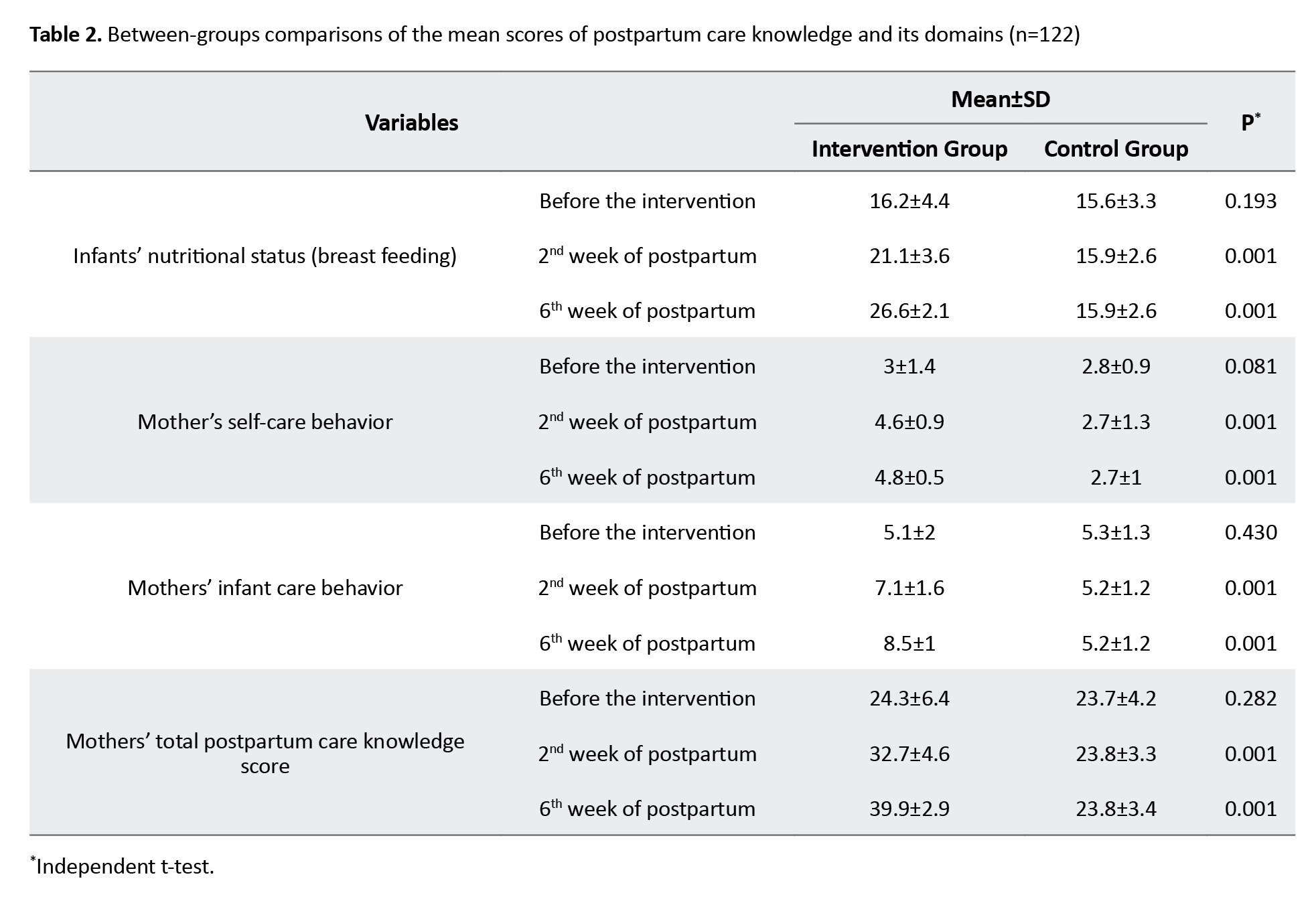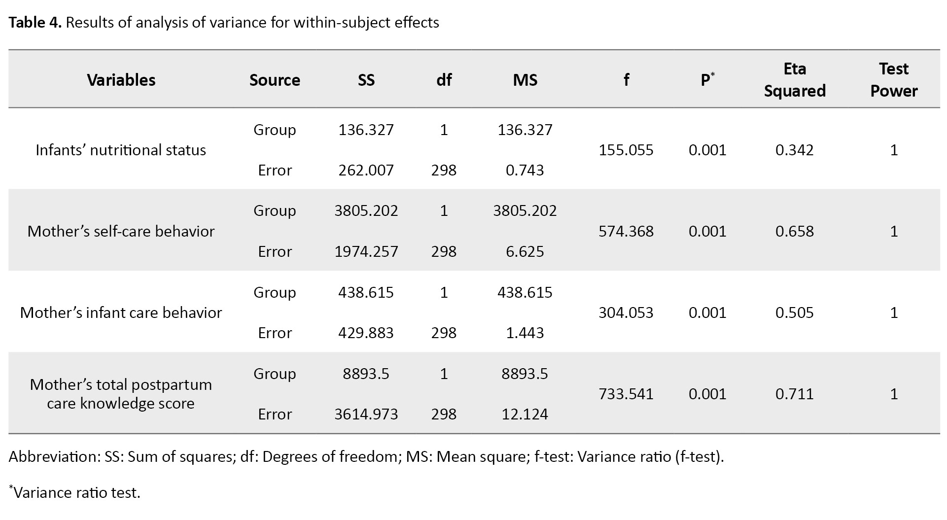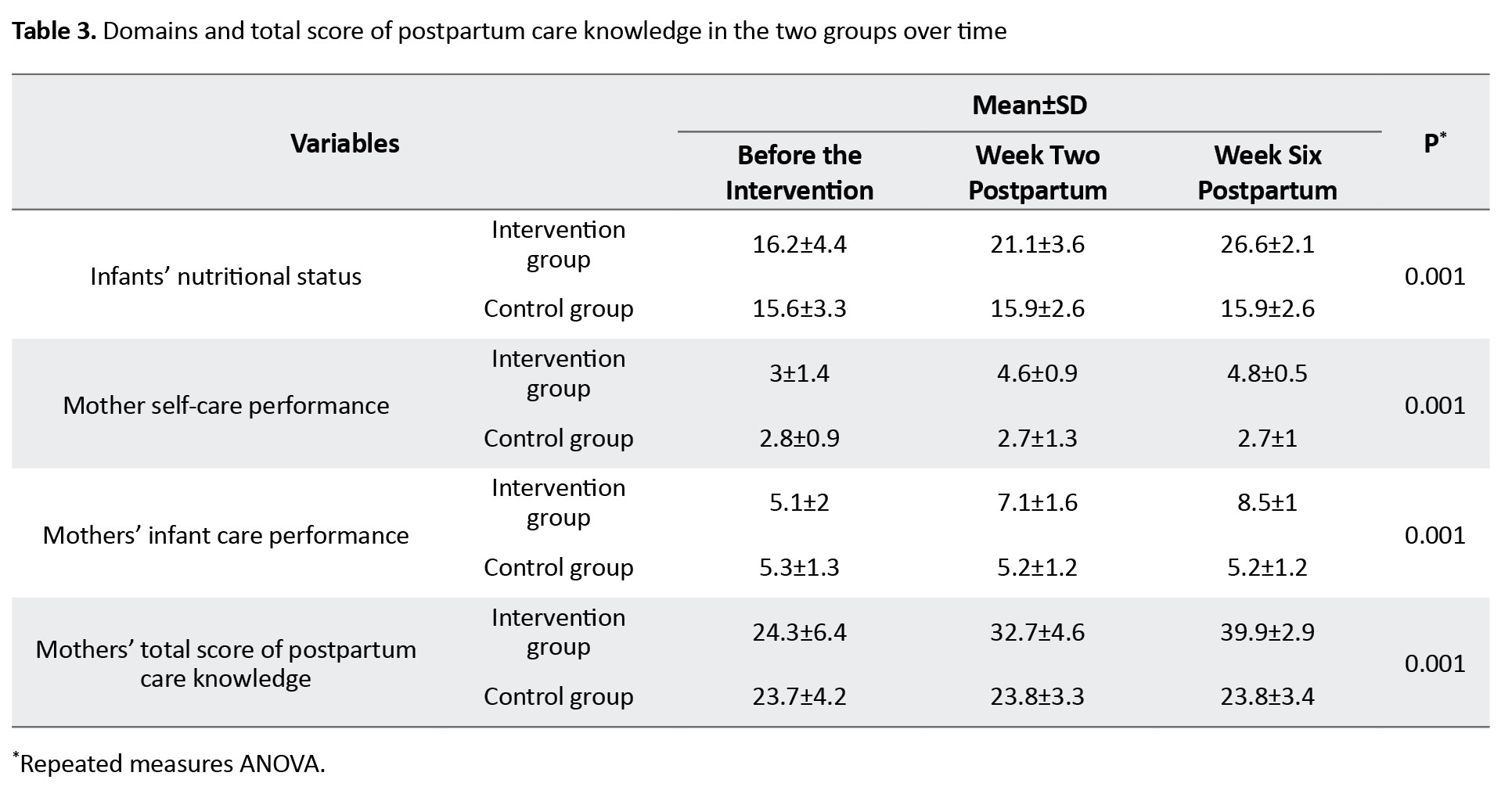 Nevertheless, the scores of these variables in the other two stages (days 14-15 and days 42-45 postpartum) differed significantly between the two groups (P=0.001). The repeated measures ANOVA was used to compare these four variables in the intervention and control groups over time. The results showed a significant increase in the mean scores over time in the intervention group (P=0.001), but the differences were not statistically significant in the control group for any variables. The results of within-group comparison showed that infants’ nutritional status, mothers’ self-care performance, mothers’ infant care performance, and mothers’ total postpartum care knowledge changed over time (P=0.001), as shown in