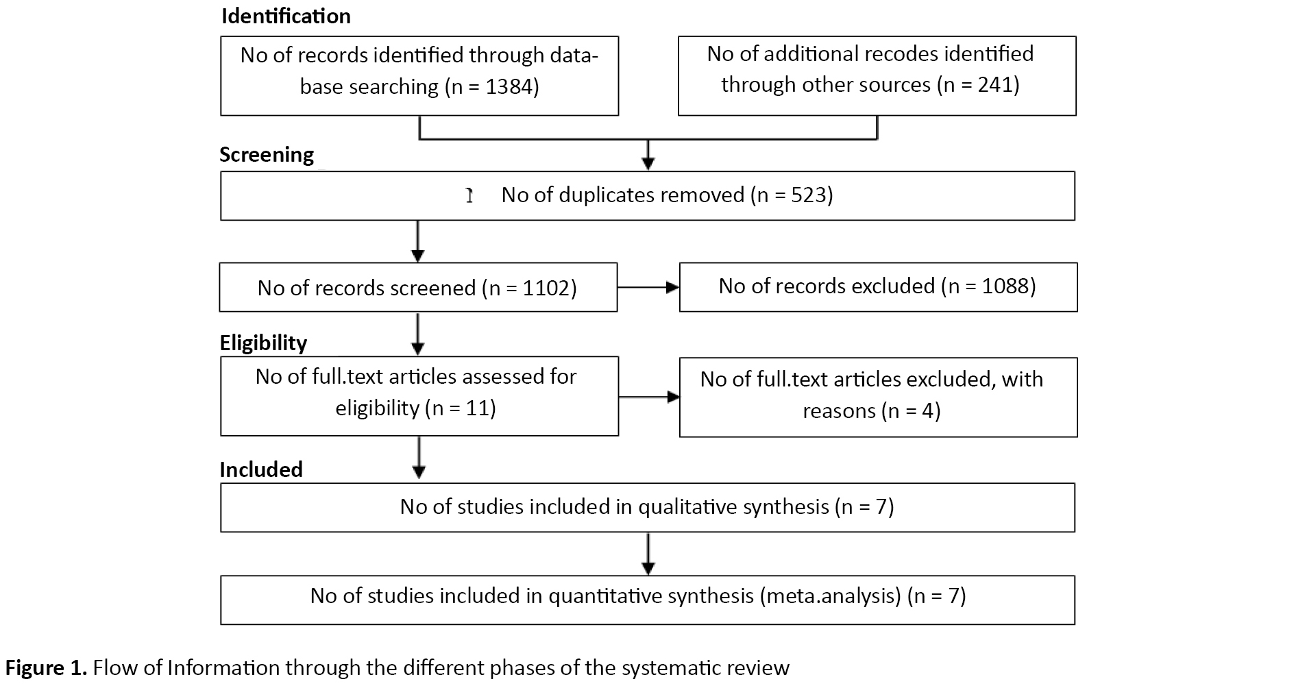 We included 1384 studies via electronic databases based on search strategy and 241 studies via checking reference lists. We did not find new studies via searching conference databases. There were 523 duplicate studies. We excluded 1088 studies after reading the title and abstract, and 14 studies were considered for reading full papers. In the end, 7 studies were included in the present meta-analysis (