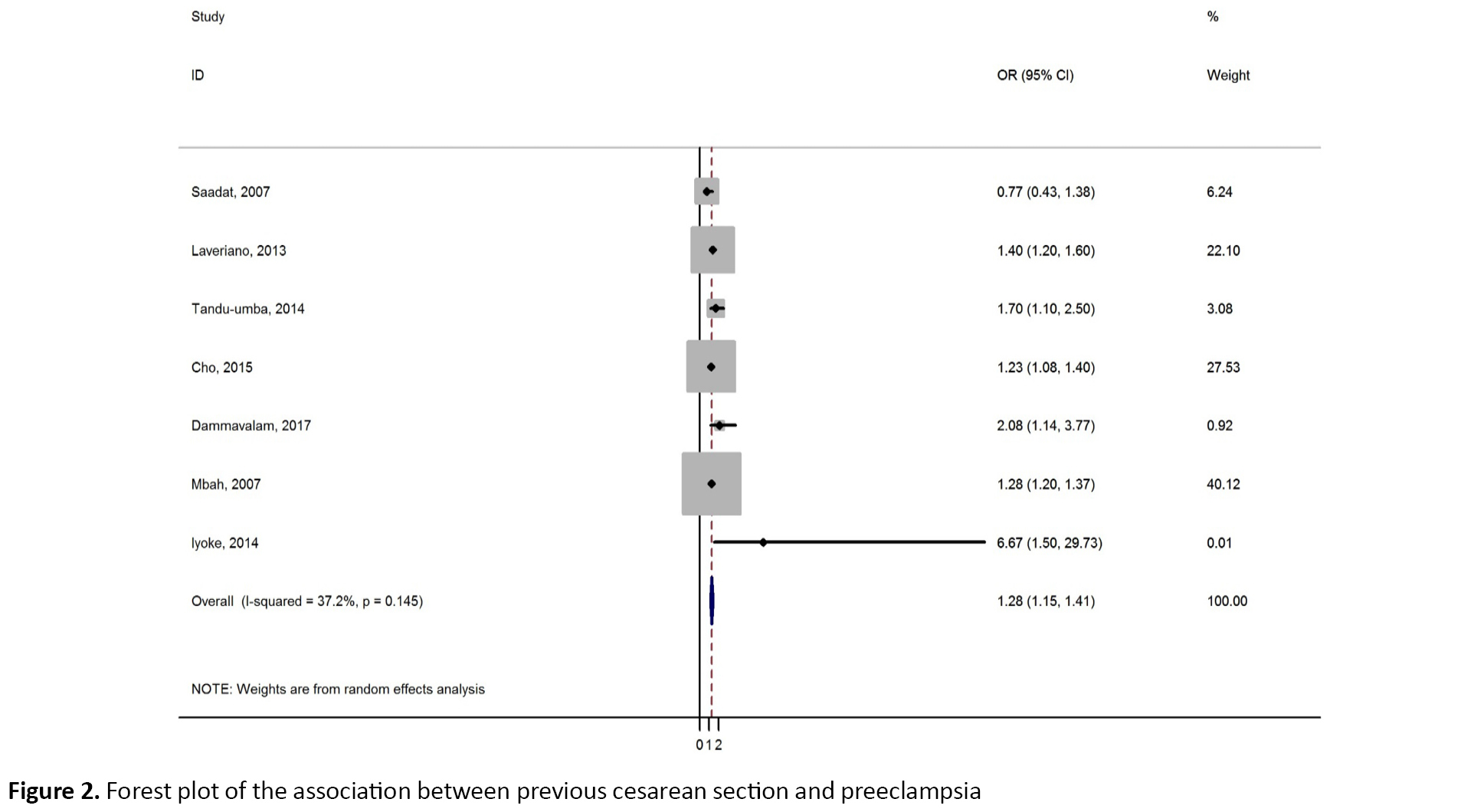 We used Stata software, version 14 for the management and analysis of data. In this study, we evaluated the association between previous cesarean section and the risk of preeclampsia based on the odds ratio (OR) and its 95% confidence interval. A random-effects model was used to analyze of data. We assessed heterogeneity across studies by using the I2 statistic. The values were 75%, 50%, and 25% based on cut-off points for high, moderate, and low heterogeneity. Publication bias was evaluated by Begg and Egger tests.