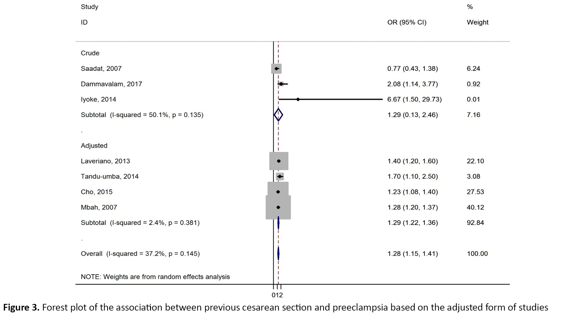 The findings of this meta-analysis presented a significant association between previous cesarean section and the risk of preeclampsia. We reported a 28% increased risk for preeclampsia in women with previous cesarean section. The heterogeneity among studies was low. According to the NOS, the quality of studies was high, except for one study. The subgroup analysis was based on the adjusted form of studies. OR in crude and adjusted studies were reported at 1.29 and 1.29, respectively.