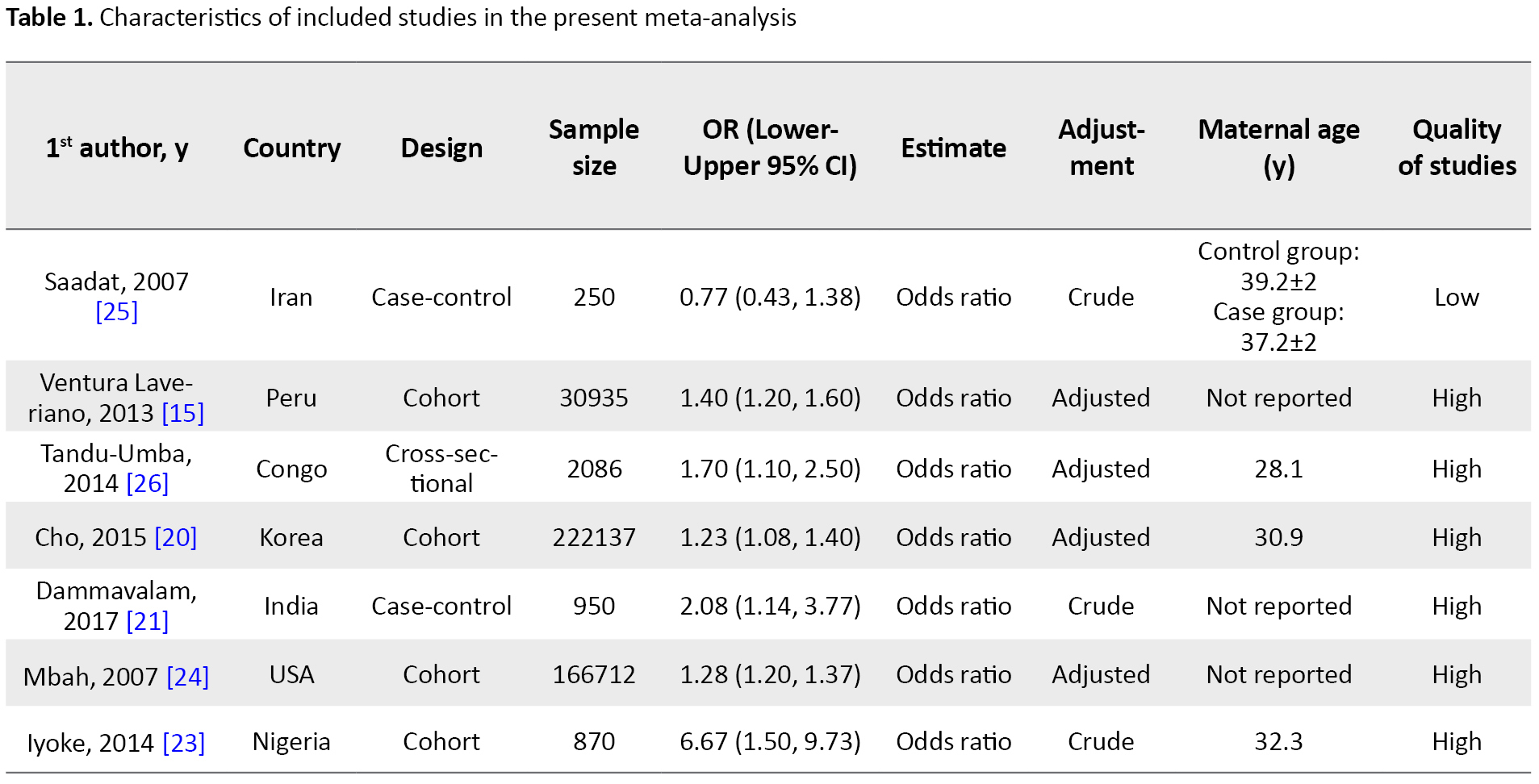 Two independent authors (EJ and SA) reviewed the retrieved studies, and the following information was extracted: (1) name of the first author, (2) publication year and location of study conduction, (3) total sample size, (4) age of maternal, (5) estimated odds ratio/risk ratio and (95% CIs), and (6) adjustment status (crude/adjusted). Any disagreements were resolved by discussion among researchers. The subgroup analysis was conducted based on the adjusted form of studies.