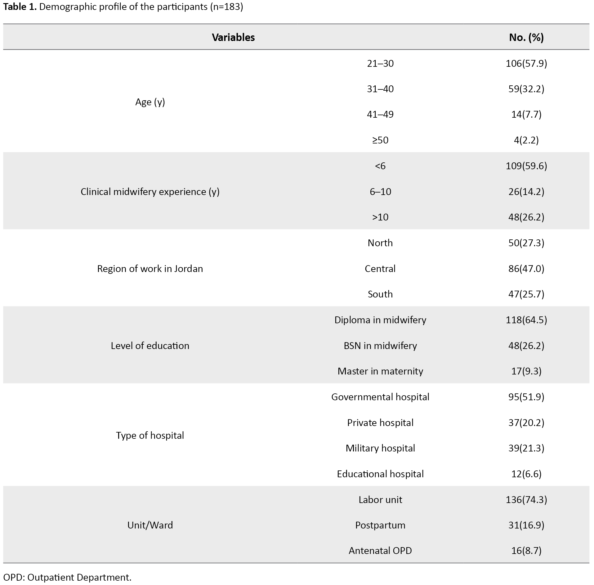 A total of 180 midwives completed the survey. Most participants (57.9%) were young midwives aged 21–30, followed by 59 participants (32.2%) aged 31–40. Regarding midwifery clinical experience, most midwives had experience of fewer than 6 years (59.6%), while only 26.2% had an experience of 6–10 years. Besides, only 14.2% had an experience of more than 10 years. Moreover, most participants were from the central region of Jordan (47%), and participants from the northern and southern regions accounted for 27.3% and 25.7%, respectively.