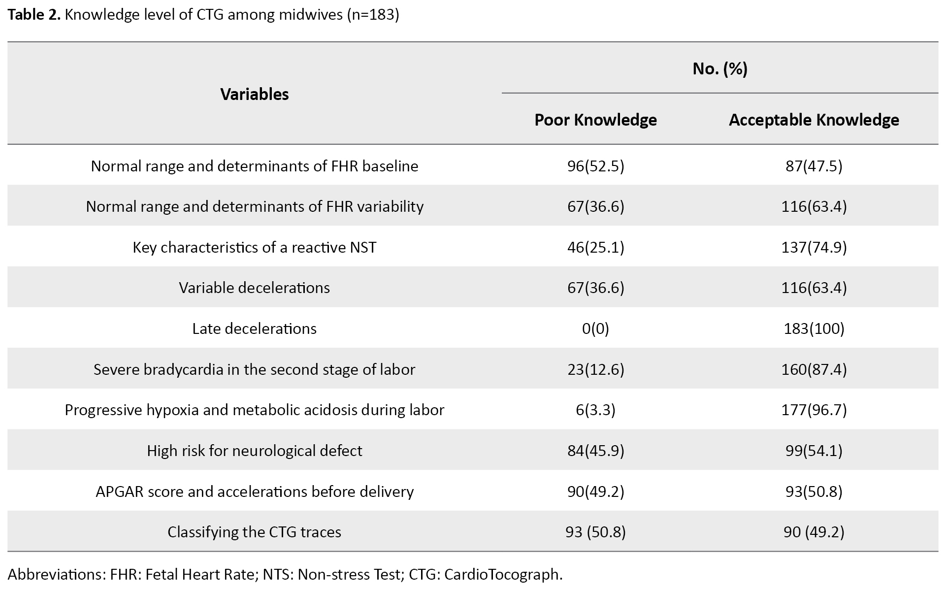 This research assessed midwives’ knowledge and attitudes regarding using and interpreting CTGs. The results indicated that midwives’ knowledge was poor regarding the normal range and determinants of the FHR baseline; however, they had acceptable knowledge about the normal range and determinants of FHR variability. Similarly, midwives reporting adequate knowledge about the key characteristics of a reactive non-stress test (NST) based on CTG were more than those with poor knowledge. Furthermore, the midwives’ attitudes differed, with a majority disagreeing on the importance of using CTG in induced labor, its importance in helping the midwife decide on medical interventions, its major benefits, and the use of CTGs.