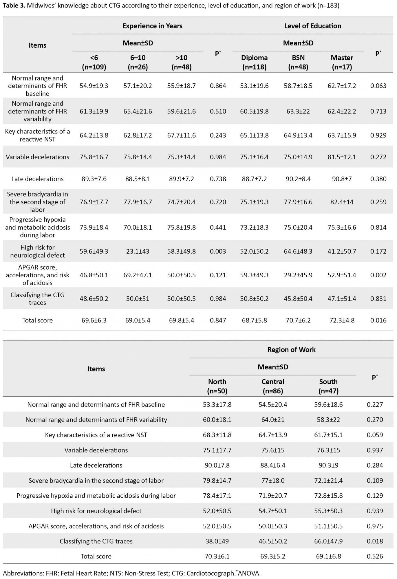 Based on this information, the mean knowledge score according to neurological defect and years of experience was significant (P=0.003), with higher knowledge scores among midwives with fewer than 6 years of experience. Furthermore, the mean score of knowledge according to APGAR score, acceleration, and risk of acidosis and the level of education was significant (P=0.002), indicating higher knowledge scores among midwives with a degree. In addition, the mean knowledge score in classifying the CTG traces was significantly correlated with the region of work (P=0.018), with higher scores among midwives from the southern region.